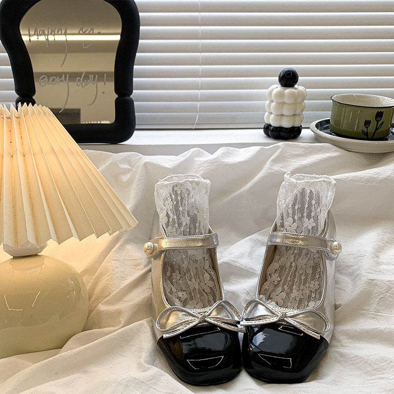 真皮~骄屿法式仙女风高跟鞋女婚鞋玛丽珍鞋珍珠系蝴蝶结粗跟单鞋