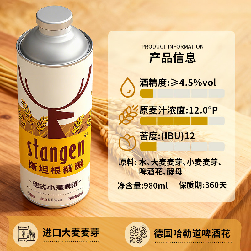 【严选】 stangen/斯坦根精酿12°P小麦白啤酒980ml*6桶整箱原浆