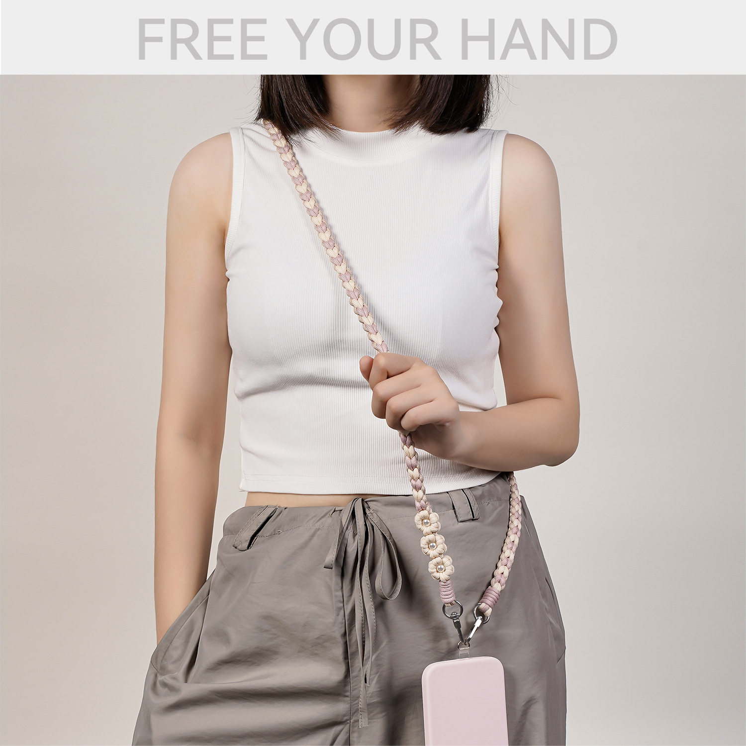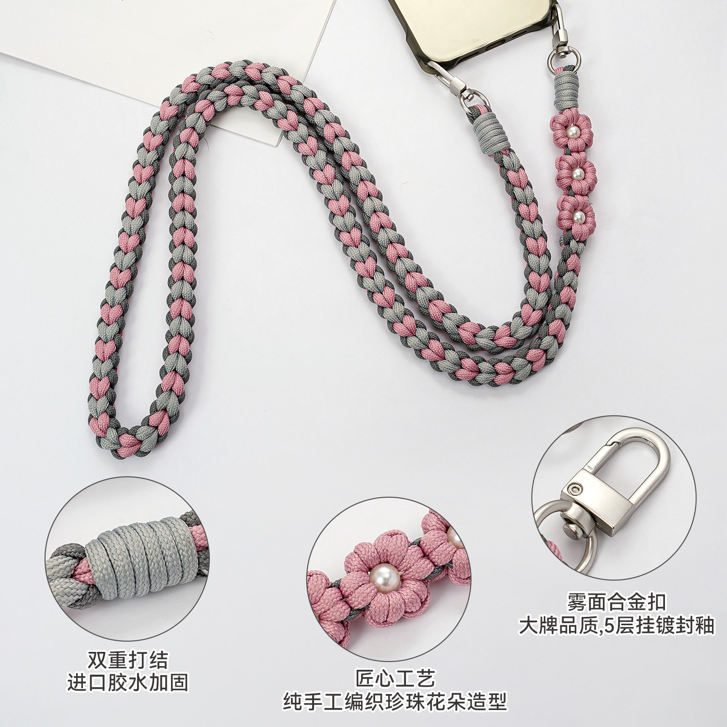 新款编织珍珠花朵手机挂绳ins风女款斜挎时尚创意个性防摔手机绳