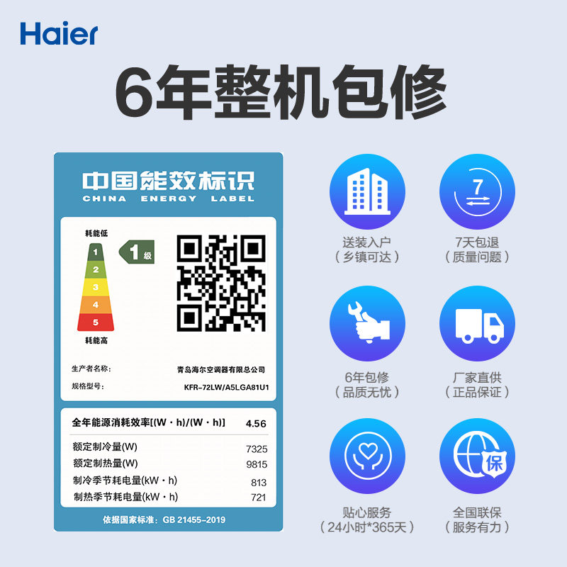 【除醛爆款】海尔空调劲爽家用官方3匹一级变频冷暖立式柜机72LGA