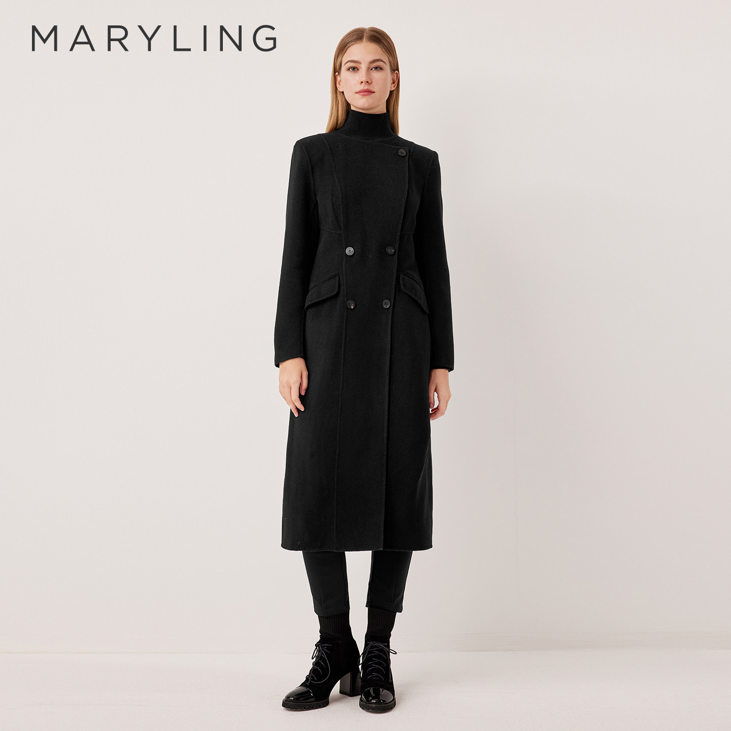 MARYLING玛俪琳2025冬季新品百搭黑色圆领复古长款大衣A1FHW93280