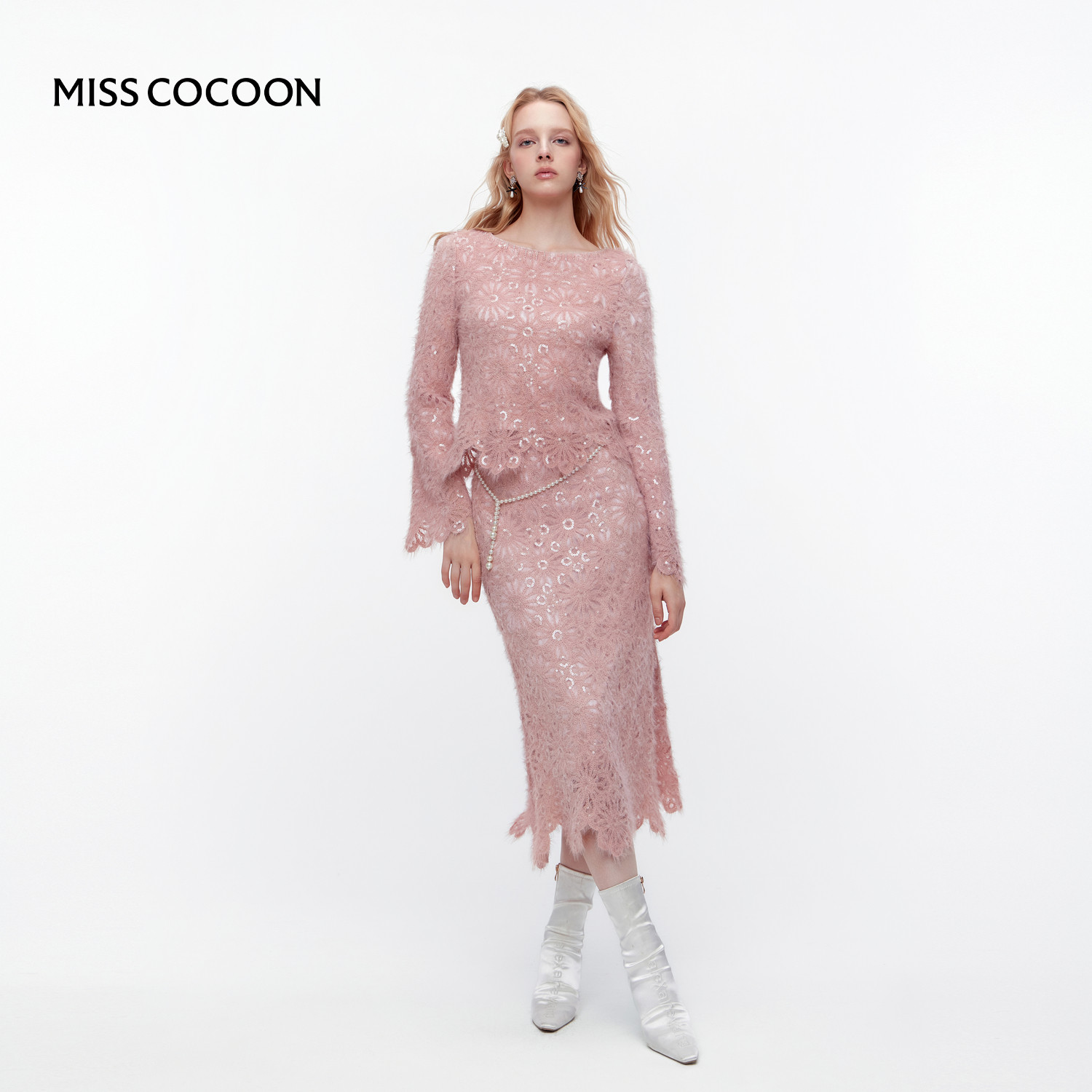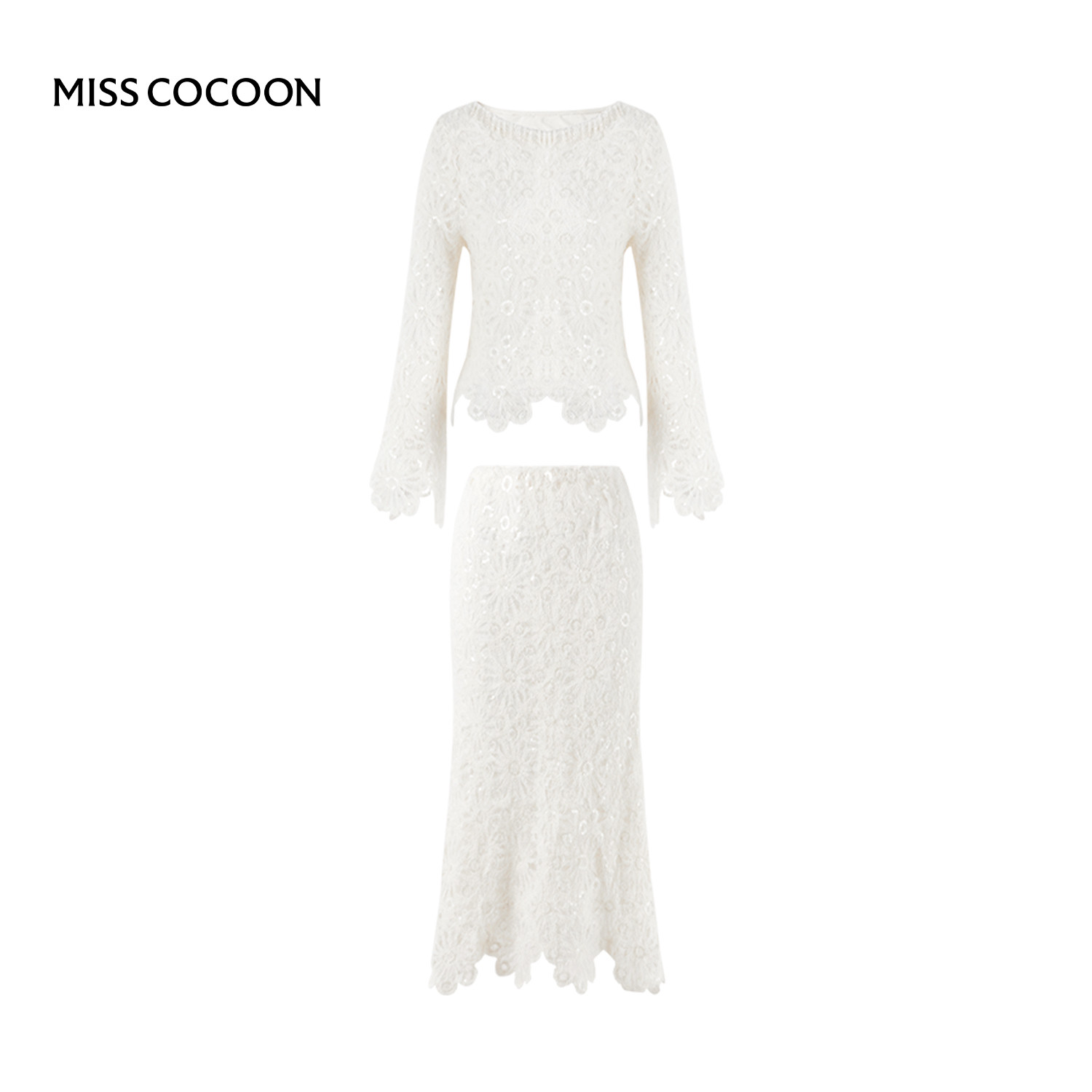 MISSCOCOON可可尼白色上衣女2025秋冬新款小香风蕾丝亮片套装裙