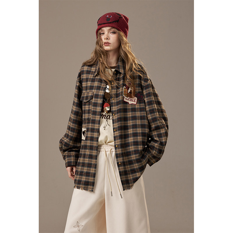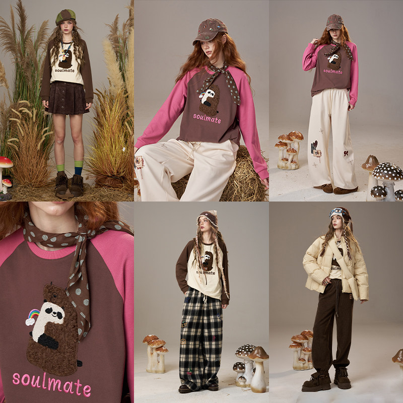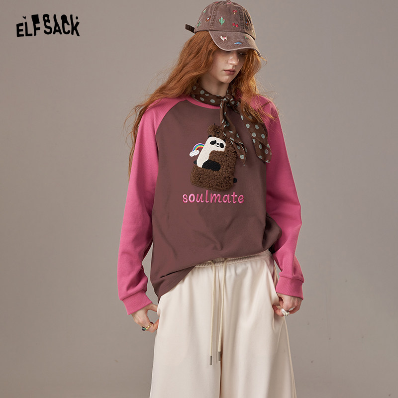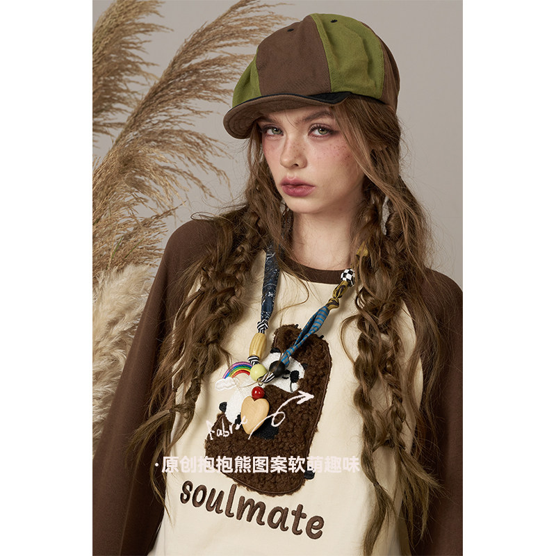 妖精的口袋撞色刺绣插肩长袖t恤女2025年秋冬新款设计感内搭上衣