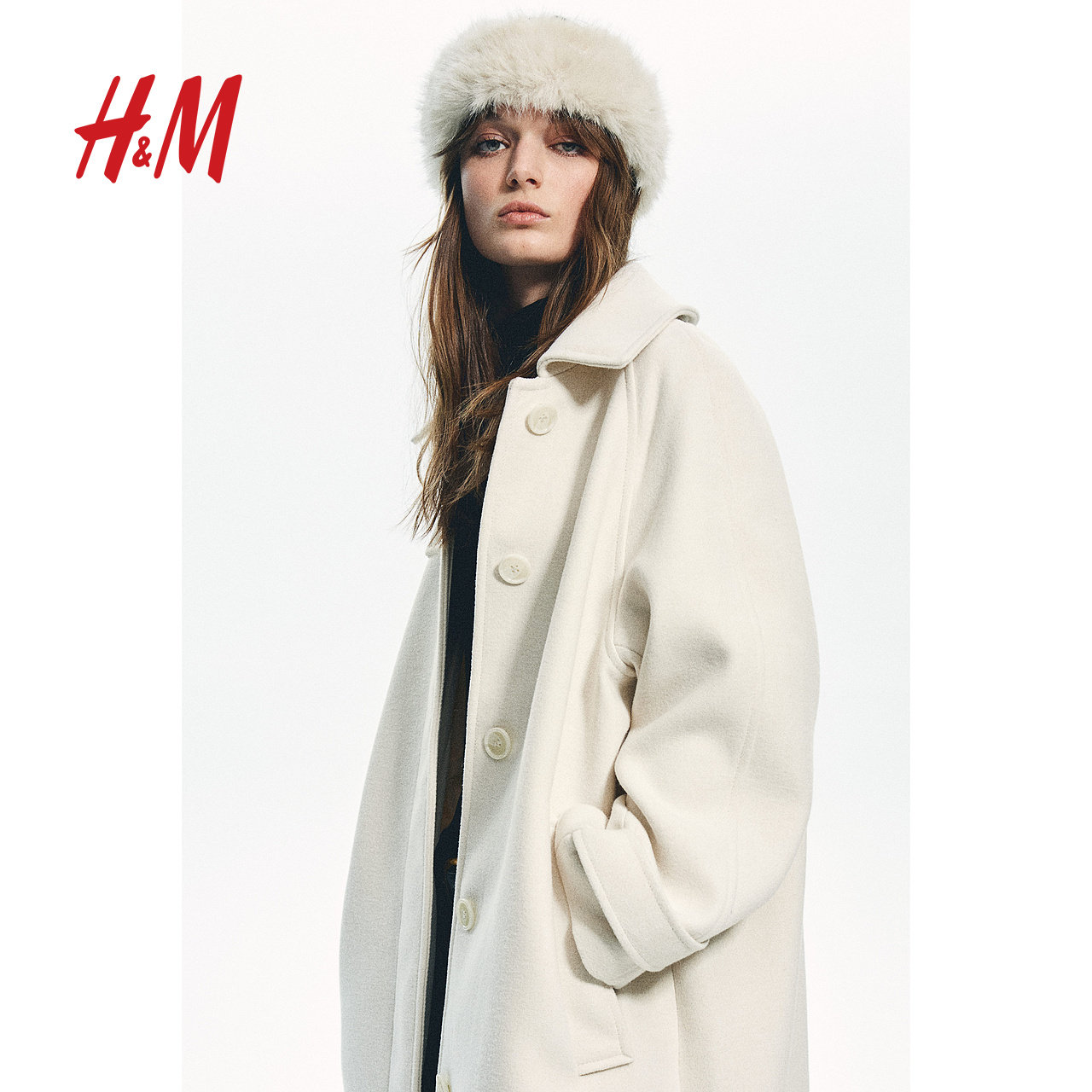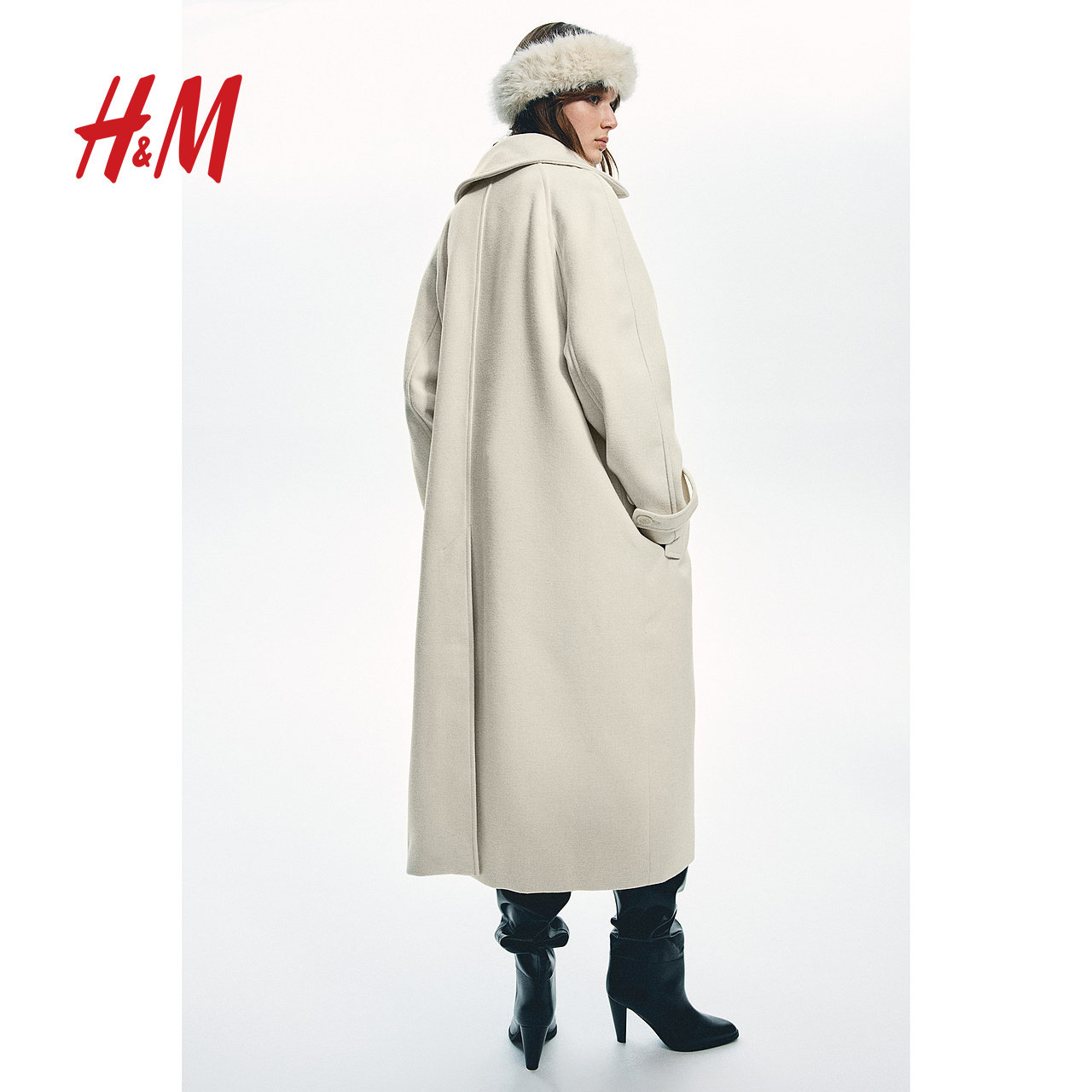 HM女装毛呢外套冬季保暖大廓形宽松翻领长款大衣1249582