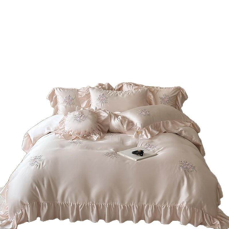 少女心透气丝滑莱赛尔四件套唯美花卉刺绣凉感夏季被套床品粉米色