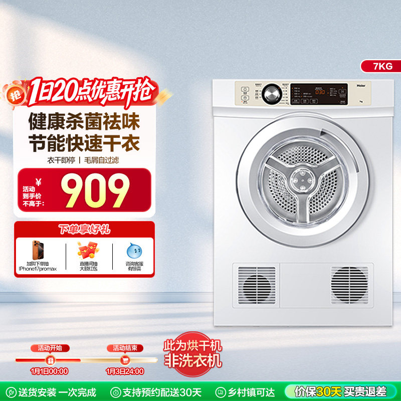【直排】海尔烘干机家用烘衣服全自动小型7kg滚筒除菌速干衣机7F