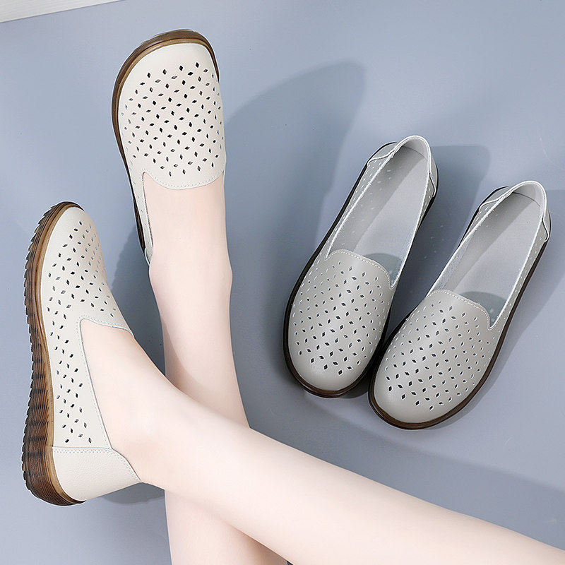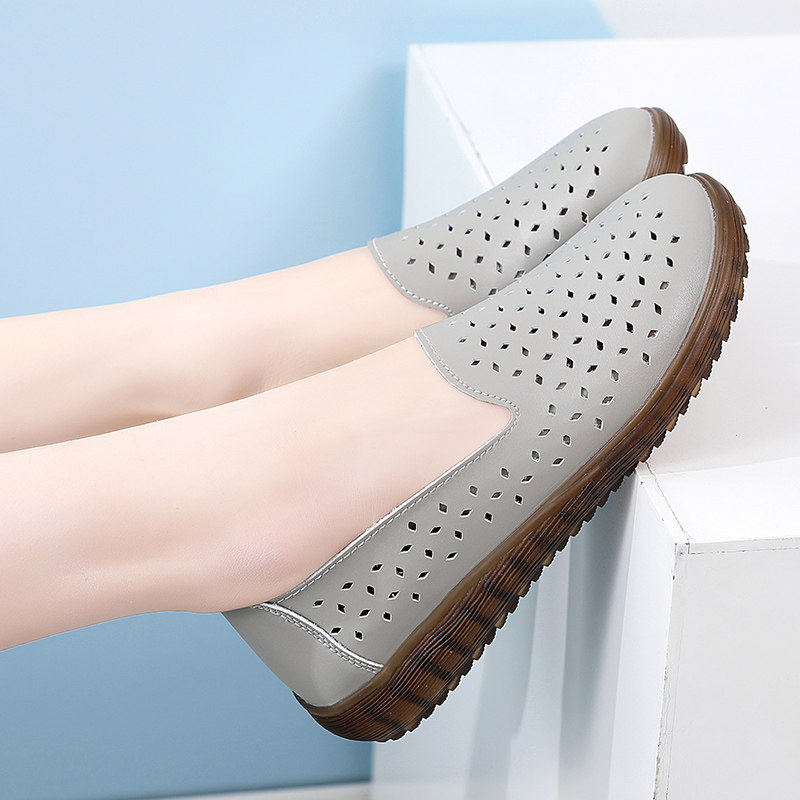 蜘蛛王真皮豆豆鞋女夏季透气镂空洞洞鞋防滑妈妈鞋夏款女鞋凉鞋软