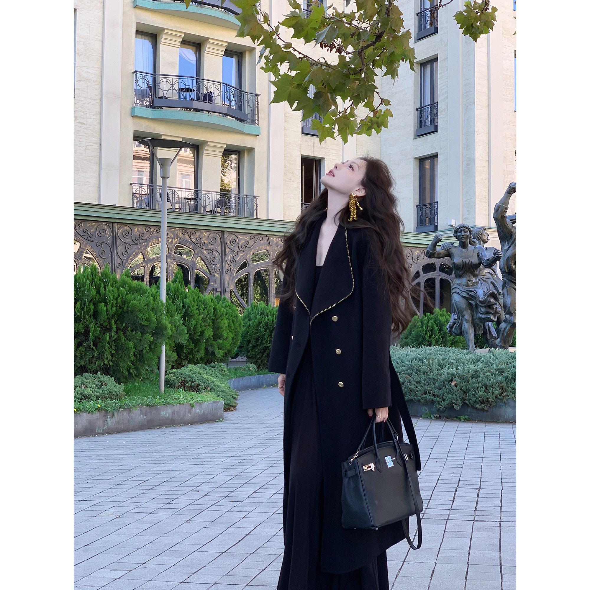 赫本风立领超长款双面呢黑色大衣女高端气质宽松高个子羊毛呢外套