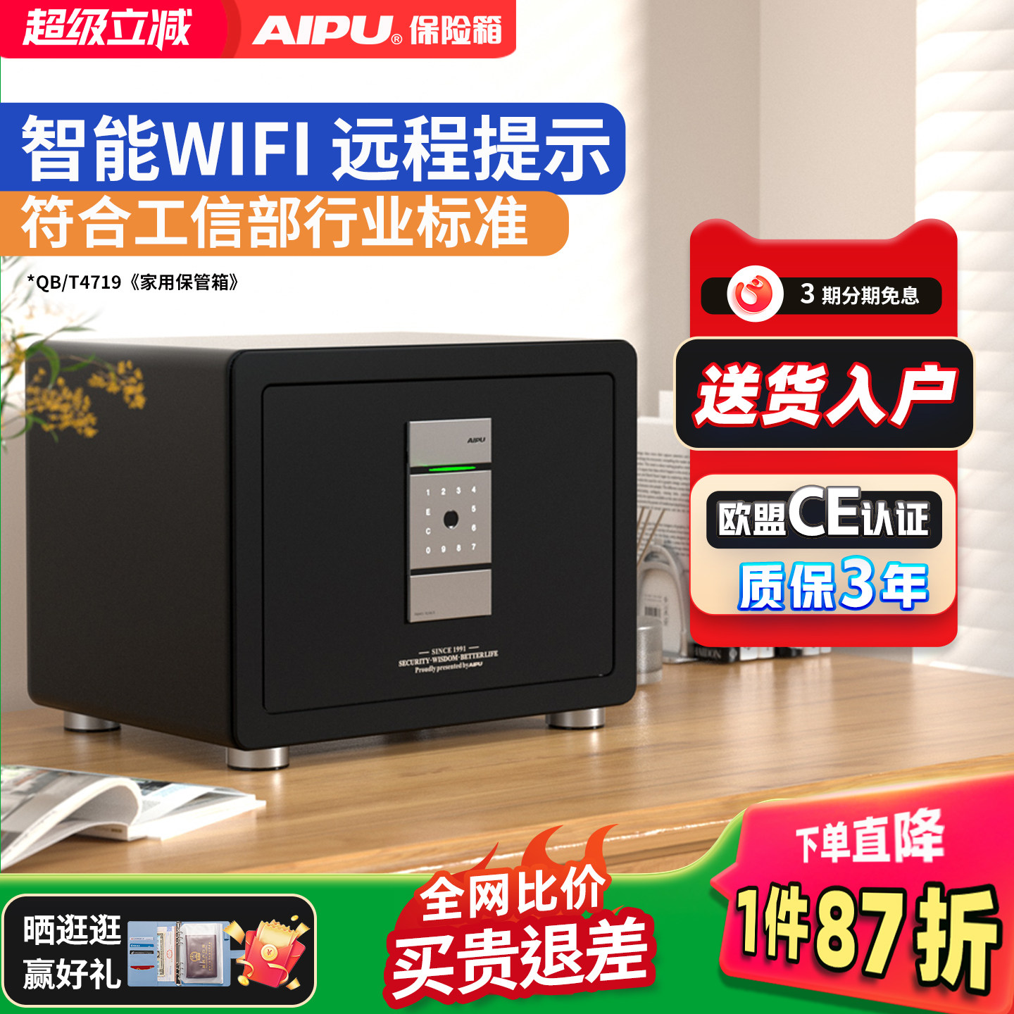 AIPU艾谱保险柜保险箱家用小型办公室智能指纹密码嵌入衣柜全钢防盗床头柜迷你家庭存钱夹万小保管箱2025新款
