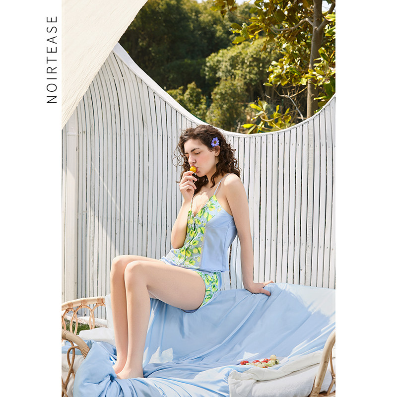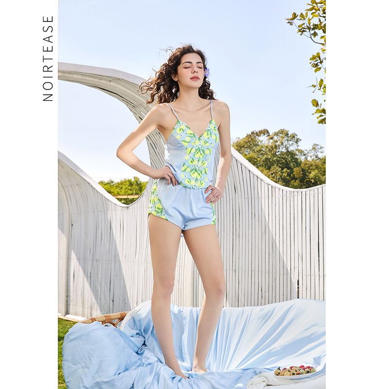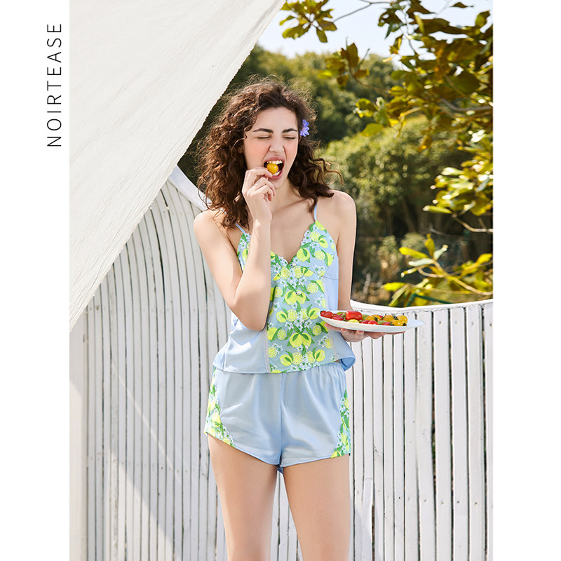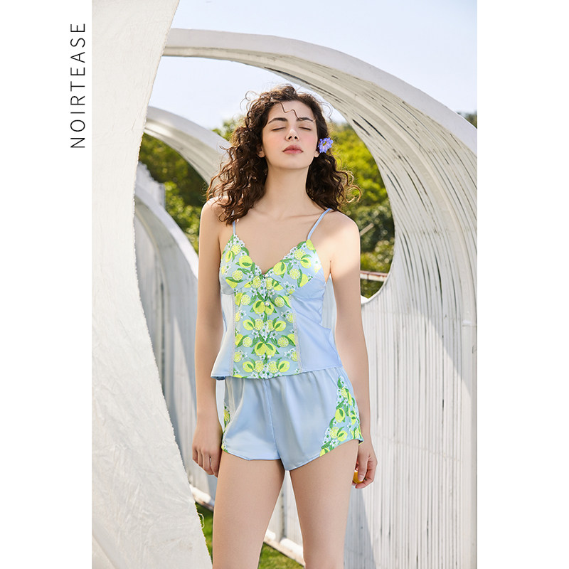 NoirTease夏季薄款丝质睡衣女士性感刺绣吊带短裤家居服两件套装
