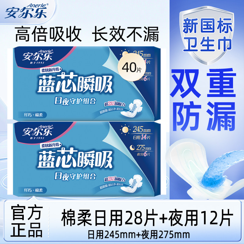 安尔乐正品卫生巾蓝芯日夜组合女学生姨妈日用夜用防漏瞬吸