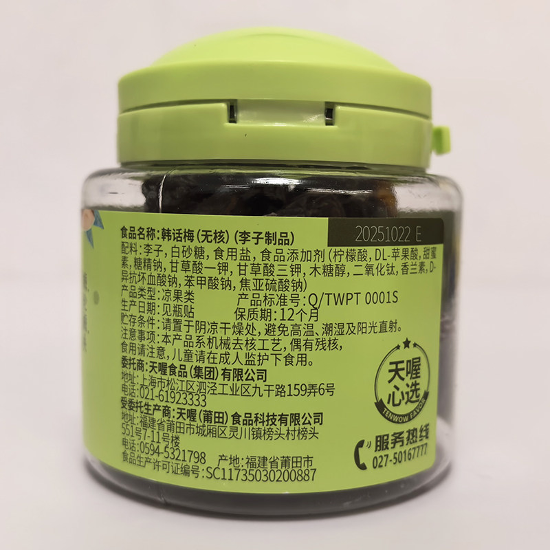 天喔无核韩话梅135g罐装蜜饯果干果脯去核休闲零食李子制品 肉厚