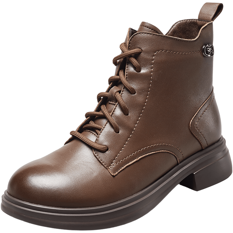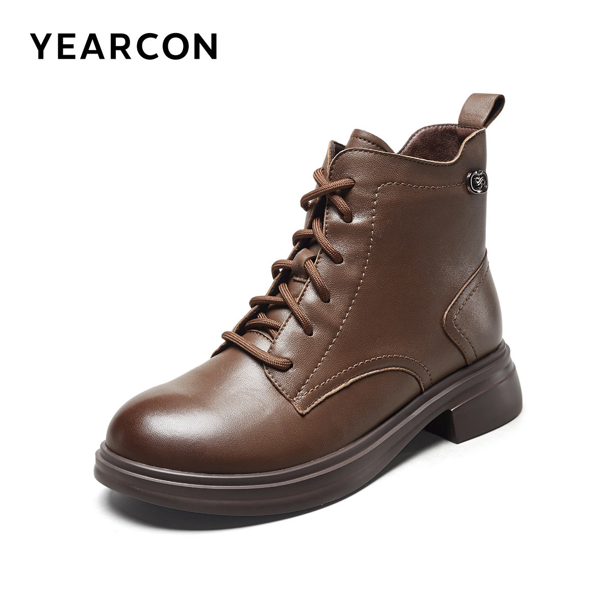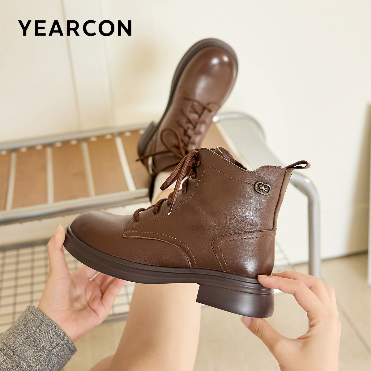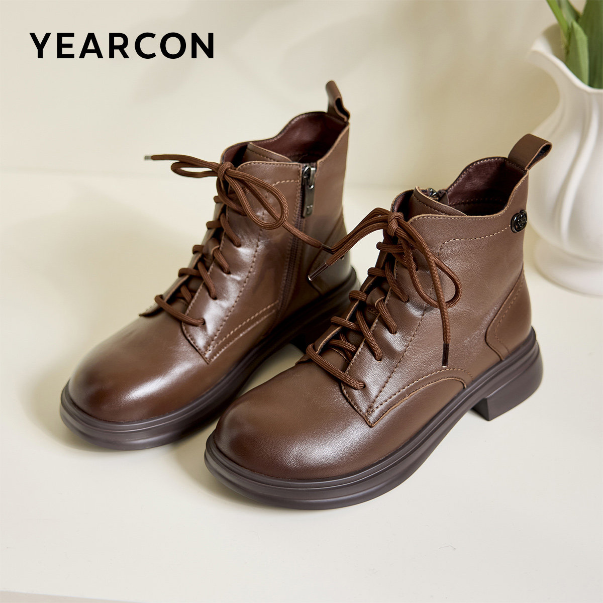 意尔康女鞋2025冬季皮鞋复古真皮休闲马丁靴粗跟英伦加绒保暖短靴