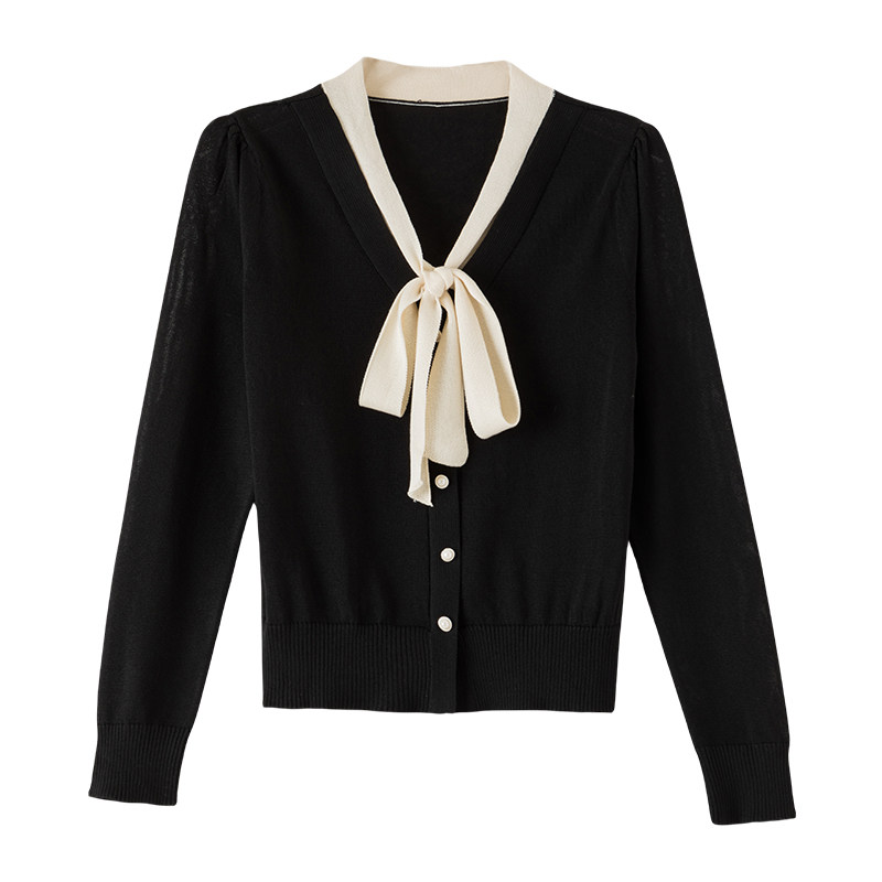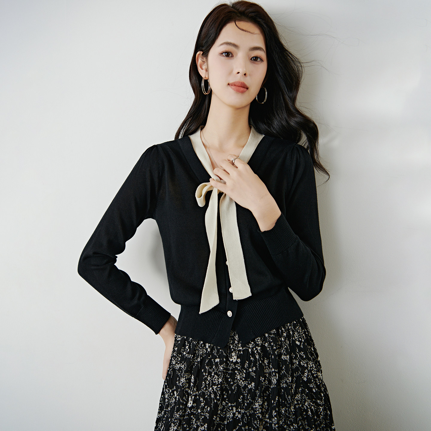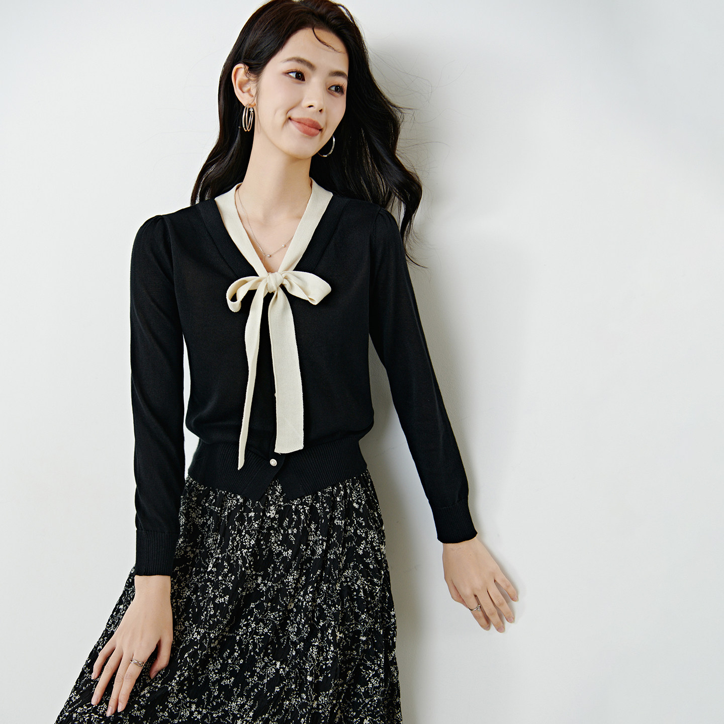 晚白2026春款经典撞色V领毛衣系带蝴蝶结莱赛尔针织衫上衣女
