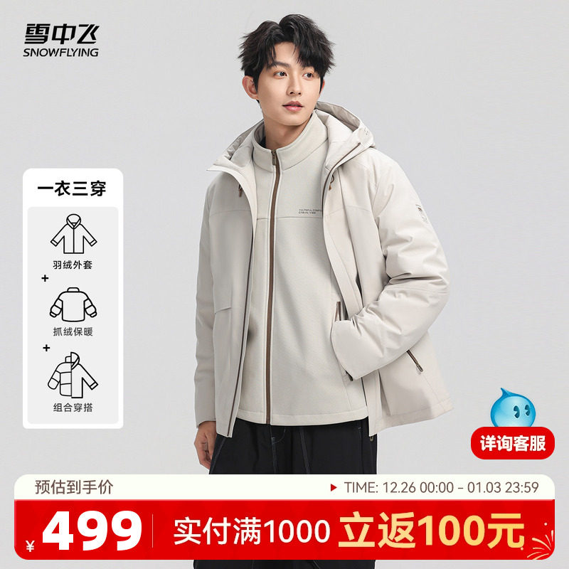雪中飞2025冬新款男士一衣三穿羽绒服运动户外抓绒工装冲锋外套