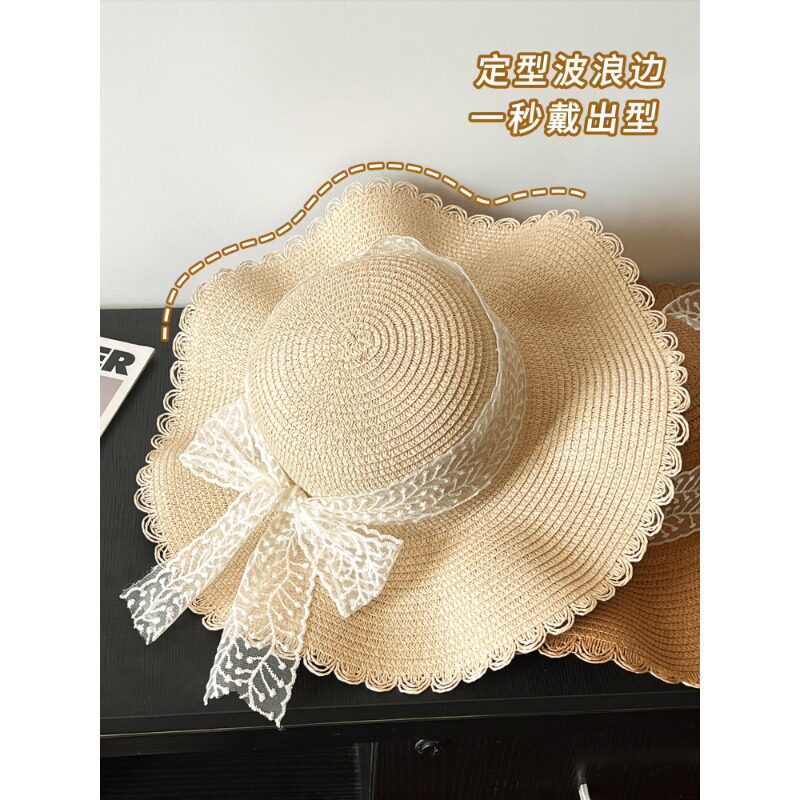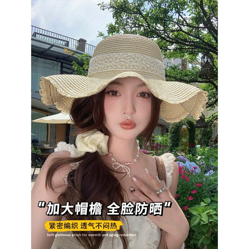 法式蕾丝草帽女款2026新款夏天海边优雅沙滩帽大檐遮阳帽百搭草帽