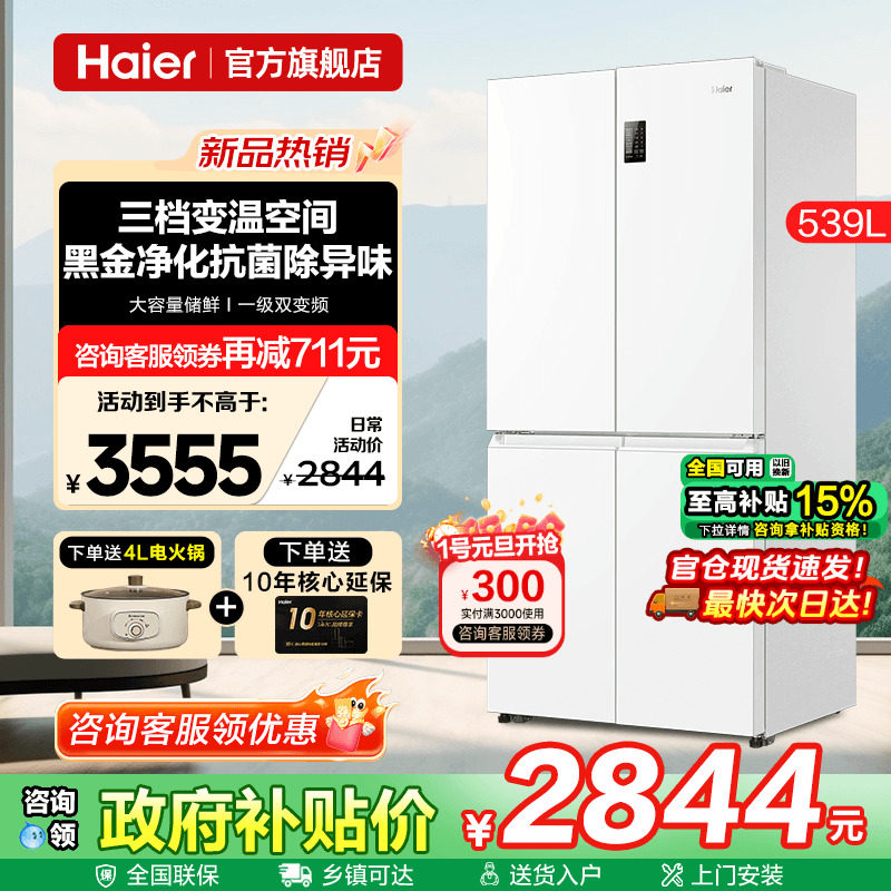Haier海尔电冰箱539L白色双开四门家用大容量无霜一级能效旗舰店