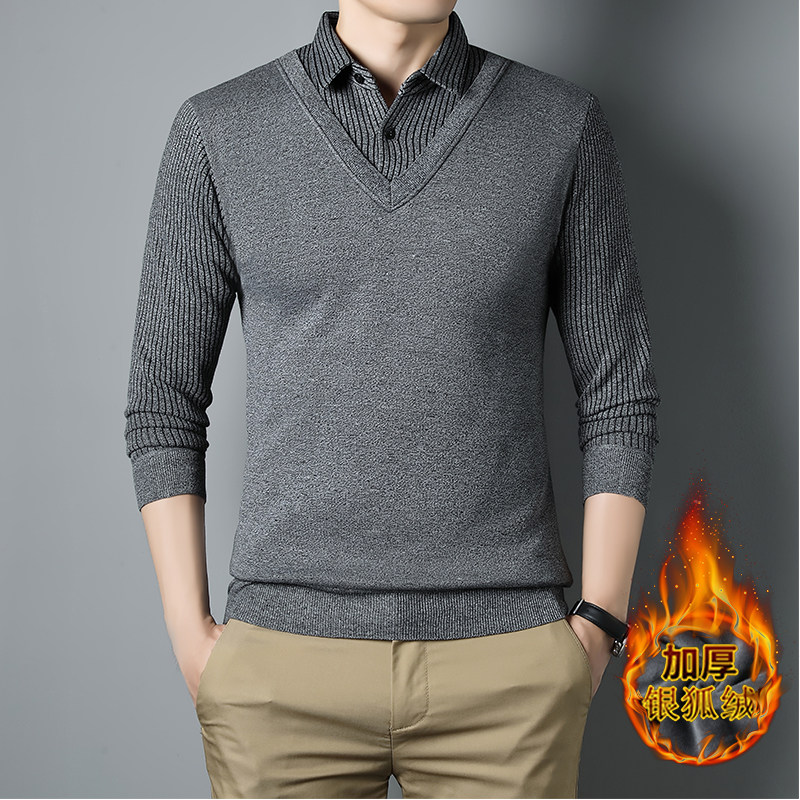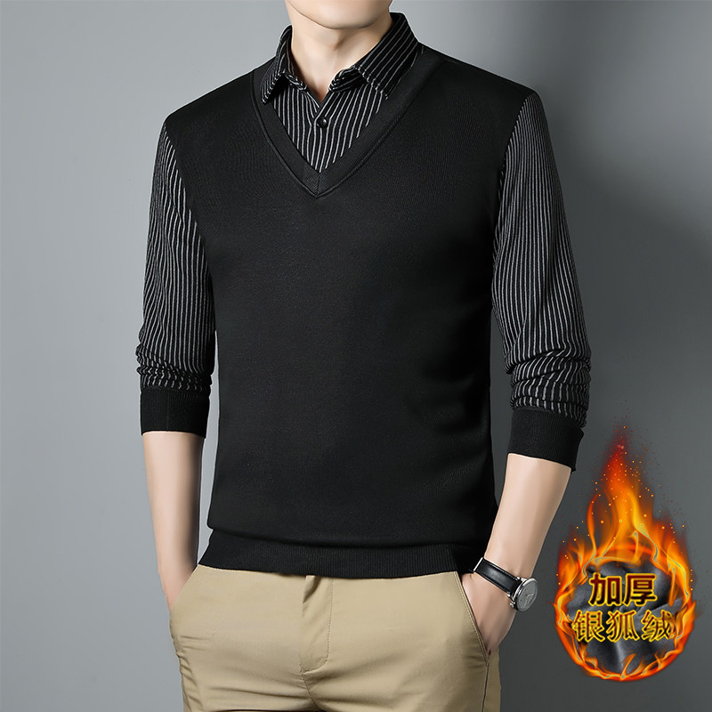 加绒加厚假两件衬衫一体绒毛衣长袖T恤男秋冬季领上衣POLO衫男装