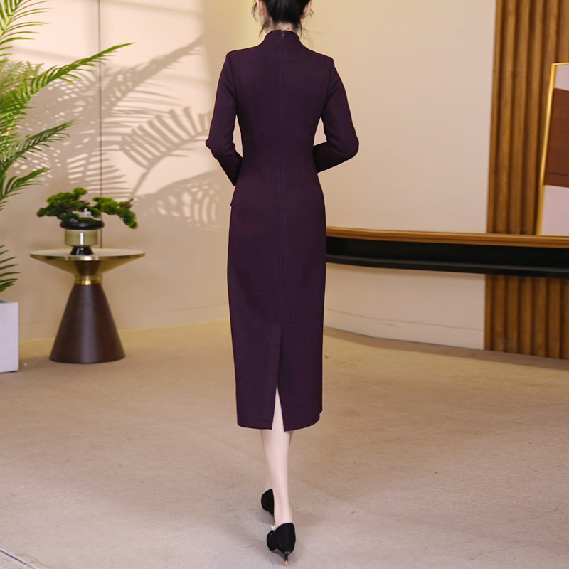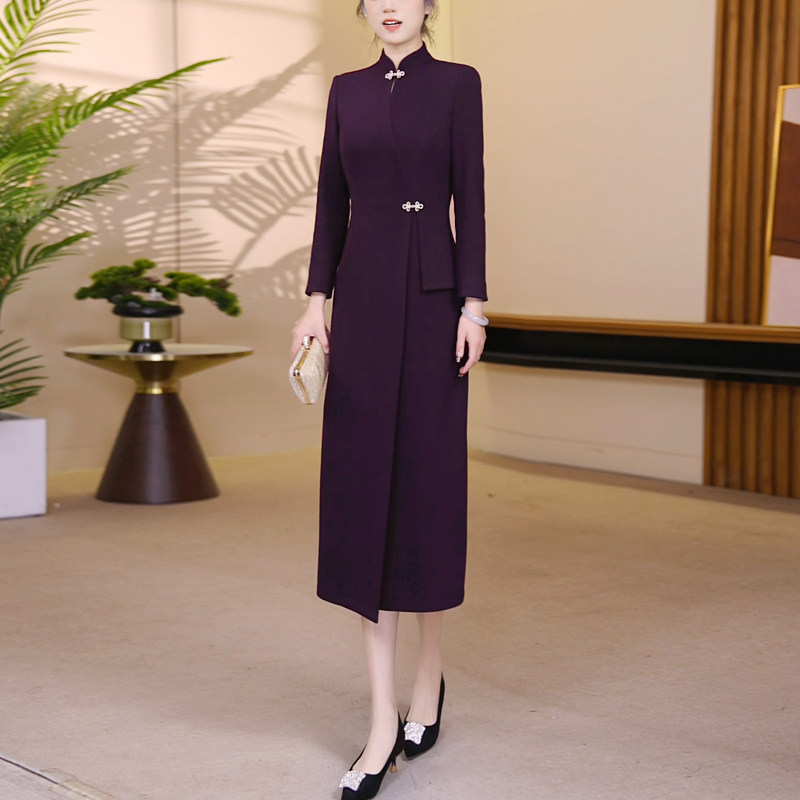 暗夜紫立领改良式旗袍假两件连衣裙2025冬新款气质修身显瘦中长裙