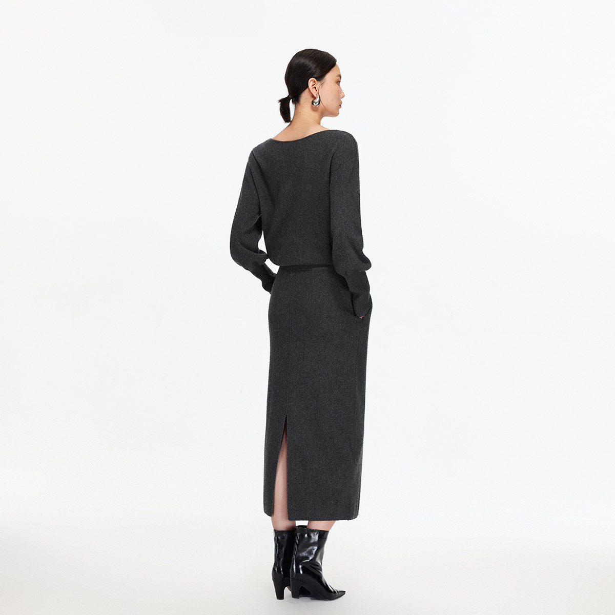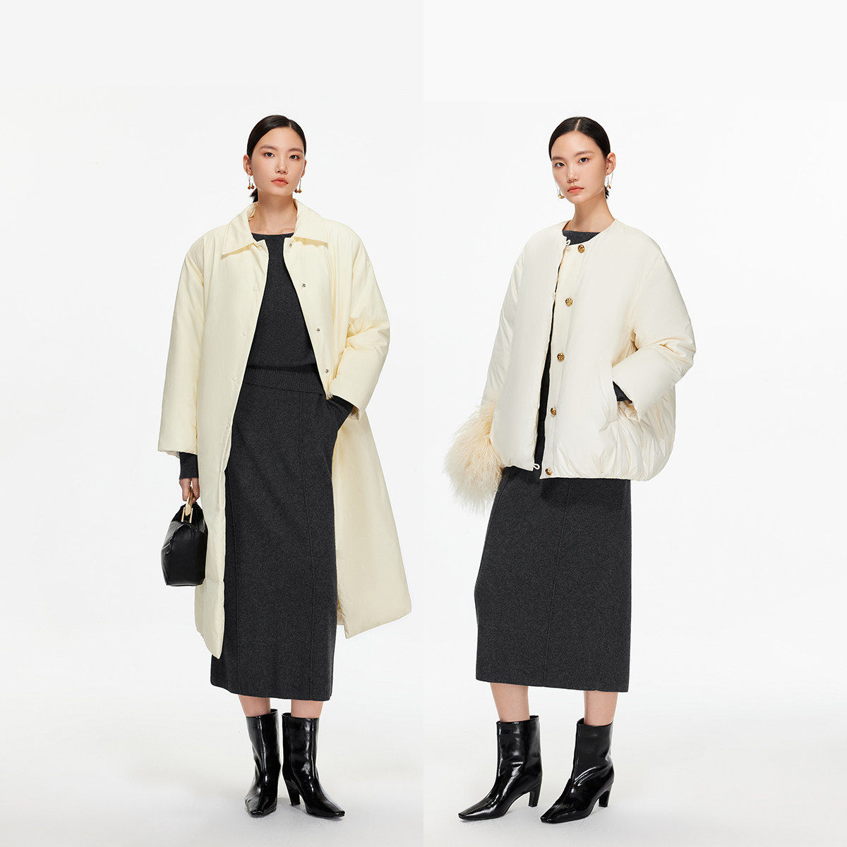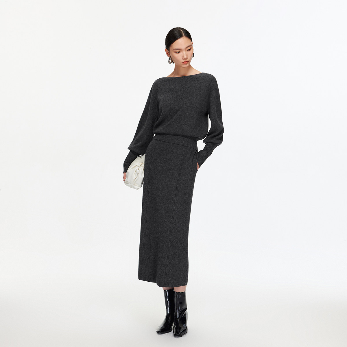 一字领设计修饰颈部比例;灯笼袖和罗纹袖口