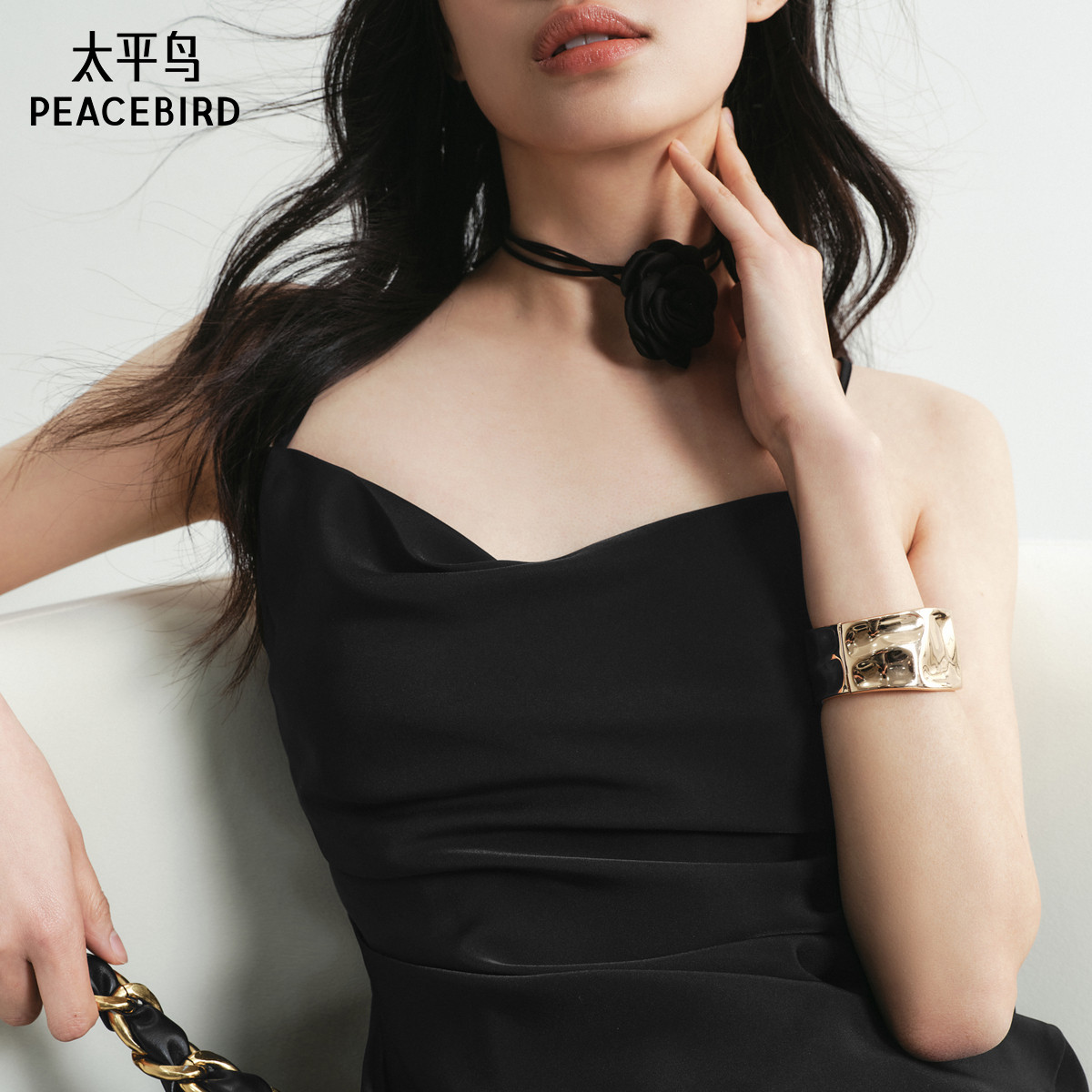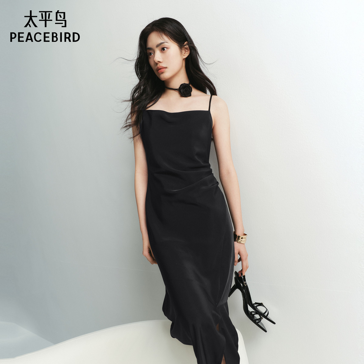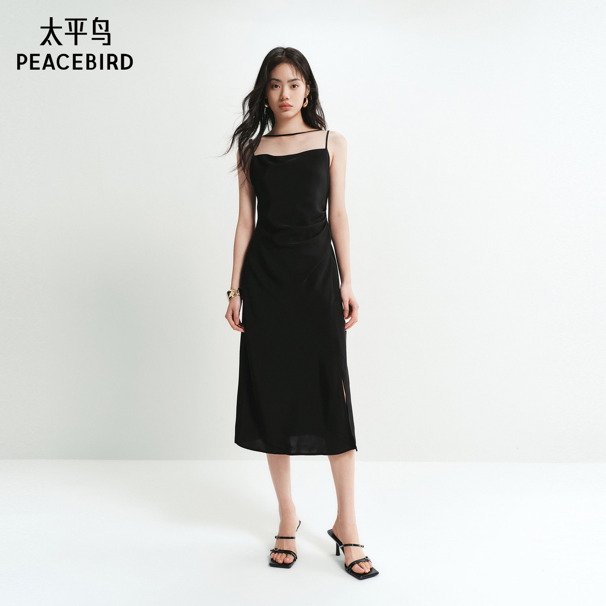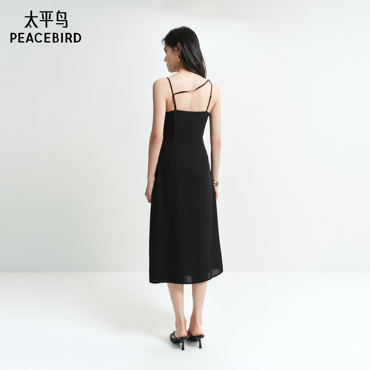太平鸟女装黑色荡领吊带连衣裙夏季款气质小黑裙法式无袖长裙