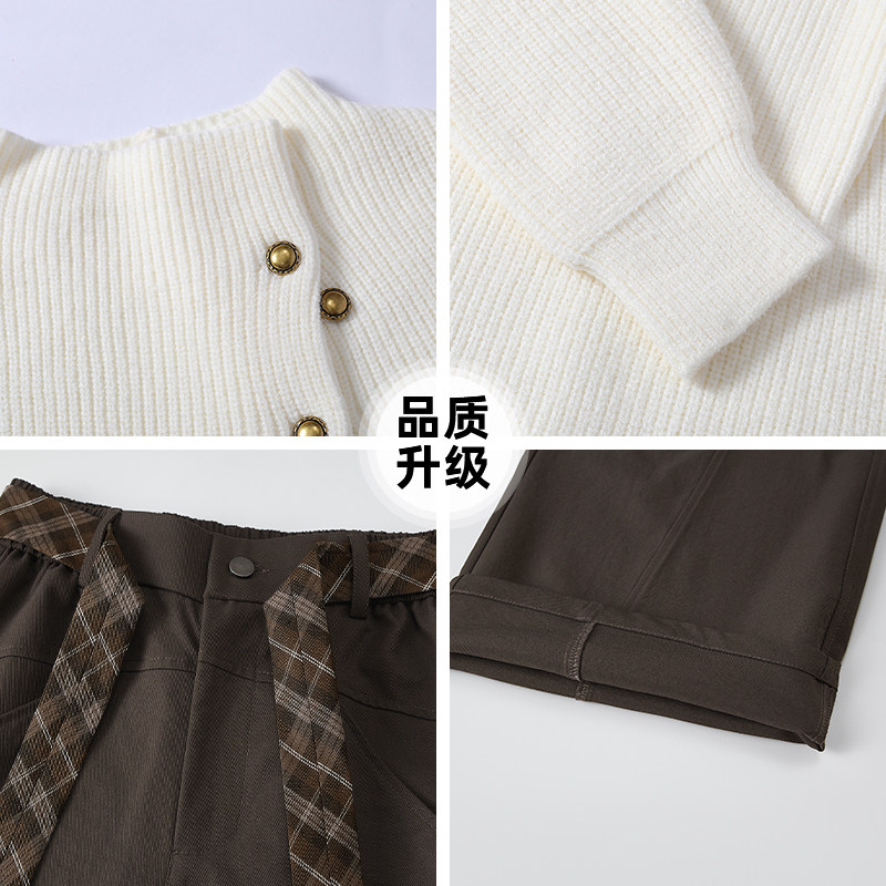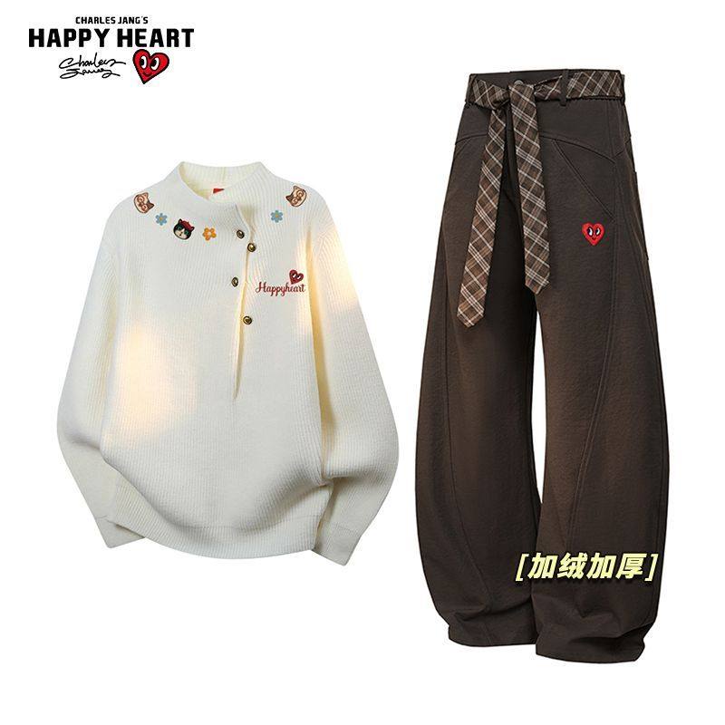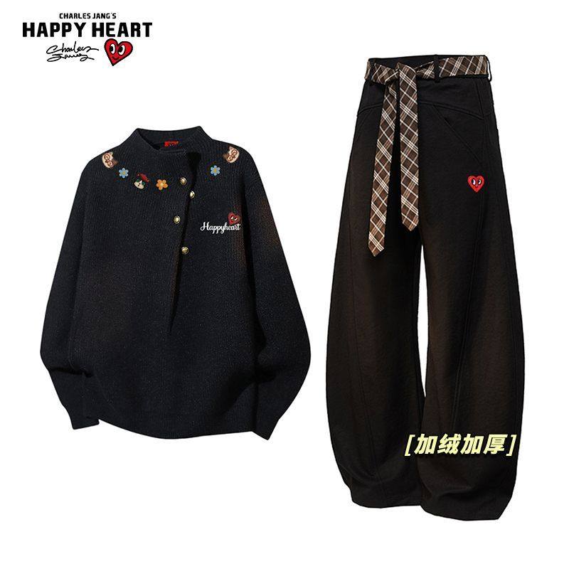 查尔斯桃心休闲套装男女冬季新款小猫针织衫毛衣加绒加厚直筒裤子