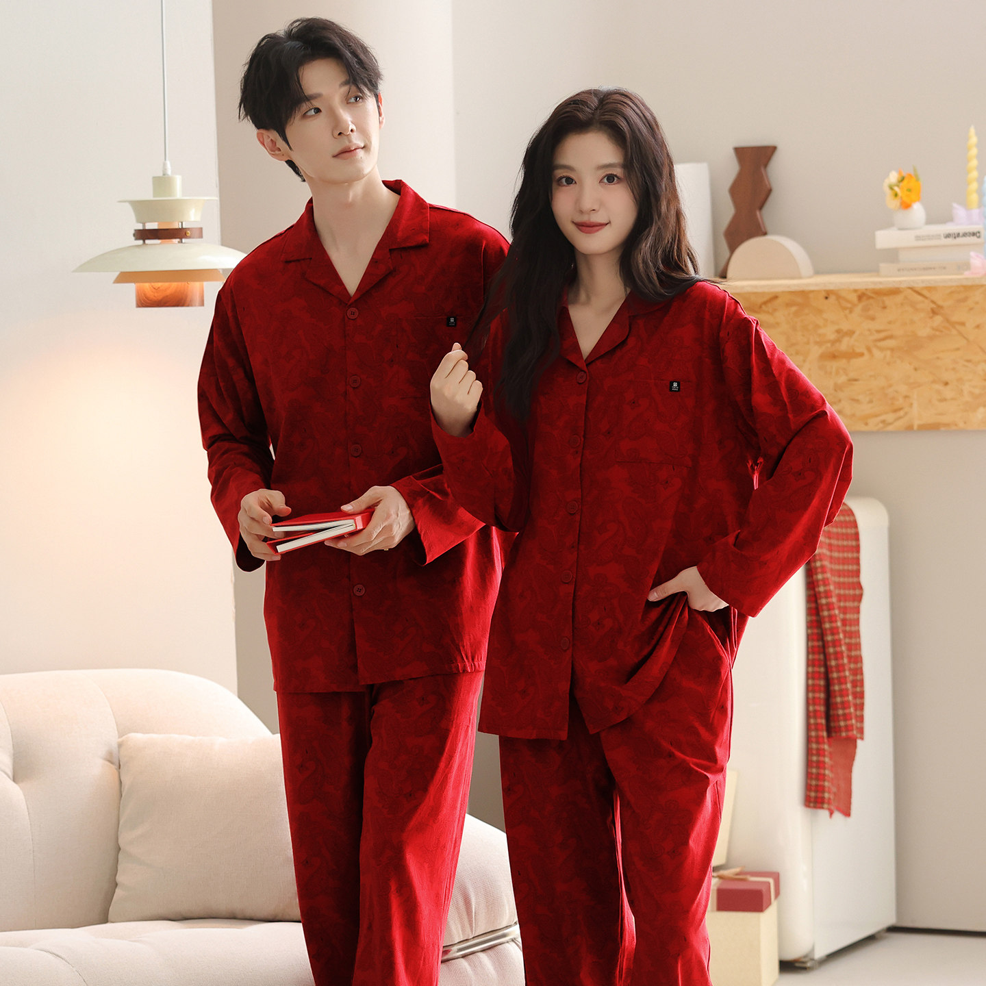 大红色睡衣情侣结婚新婚春秋款套装本命年一男一女家居服开衫柔软