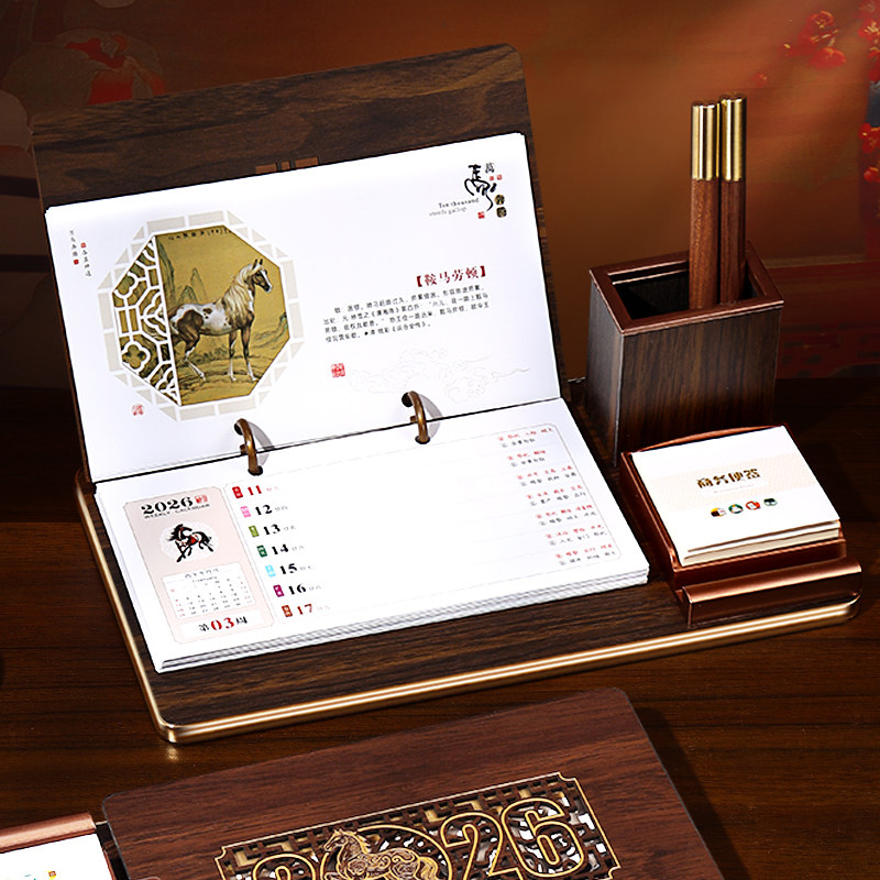 2026年新款多功能商务实木台历定制印刷企业logo新年高档精美镂空烫金翻页周历马年办公摆件打卡日历创意礼品
