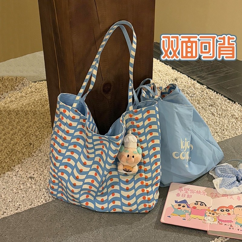 双面可背条纹帆布包小众韩版大容量慵懒风红色托特包休闲购物袋女