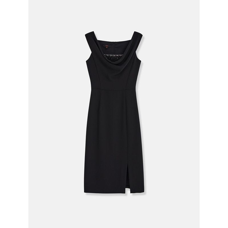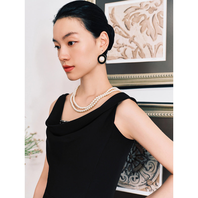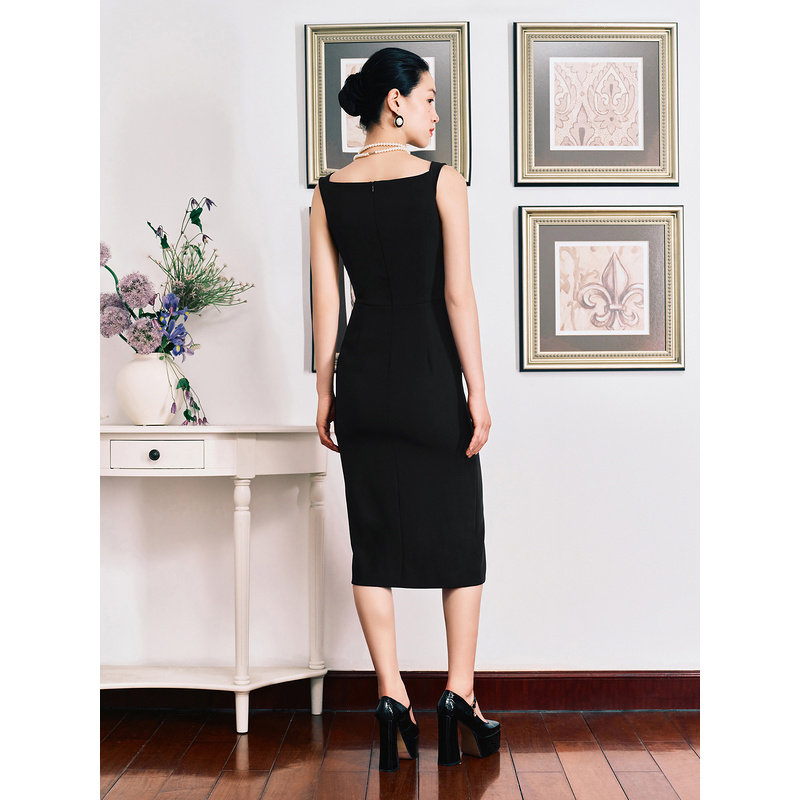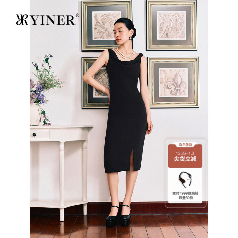 YINER音儿秋季双面斜纹法式吊带小黑裙收褶开衩连衣裙