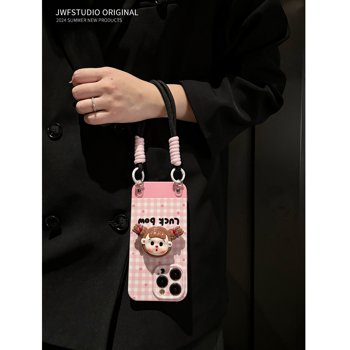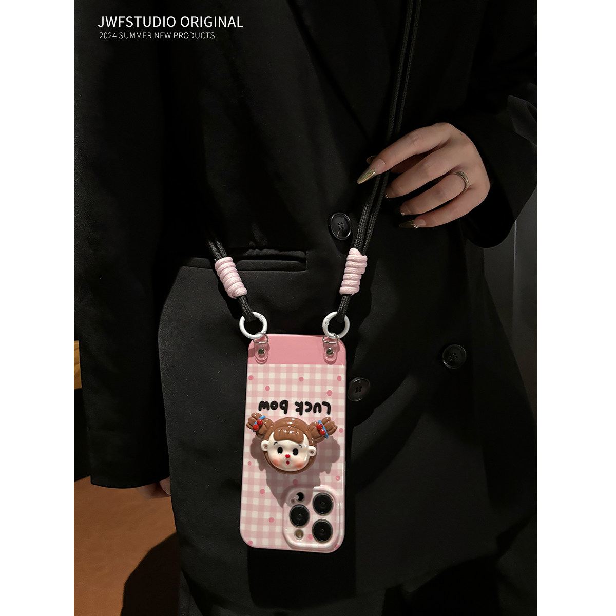 粉色格纹女孩适用苹果15promax斜挎手机壳16横竖支架iPhone17pro零钱包13/13promax手提16pr挂绳14套12软11女