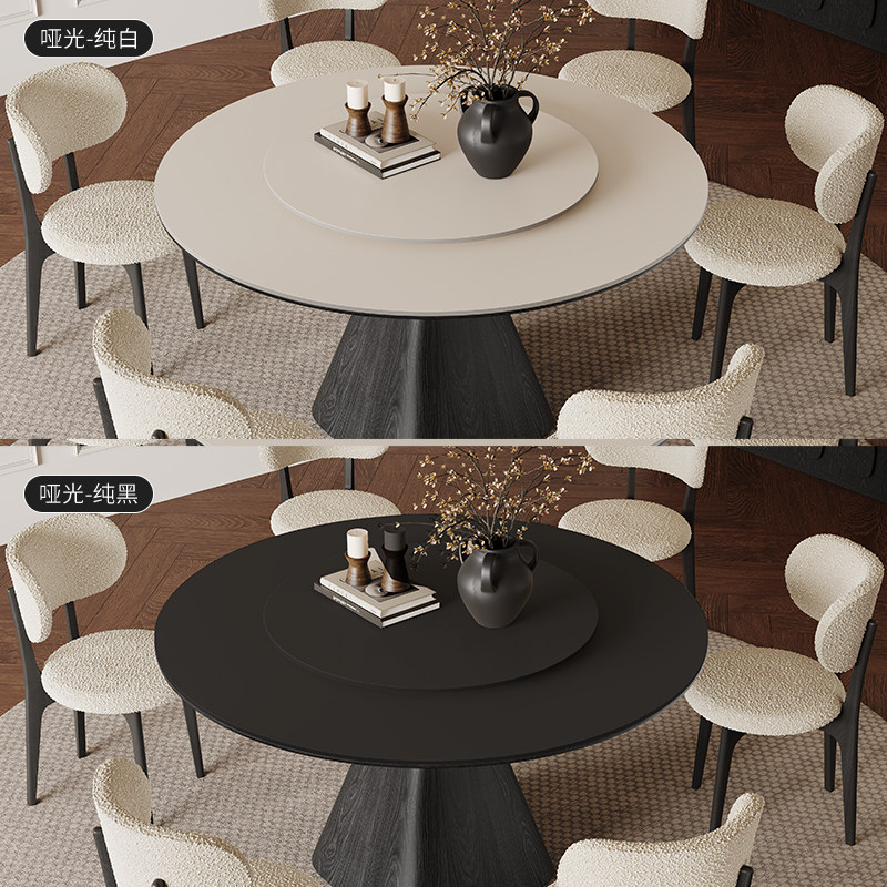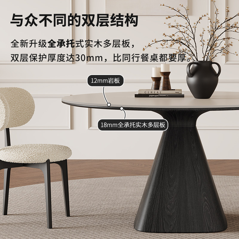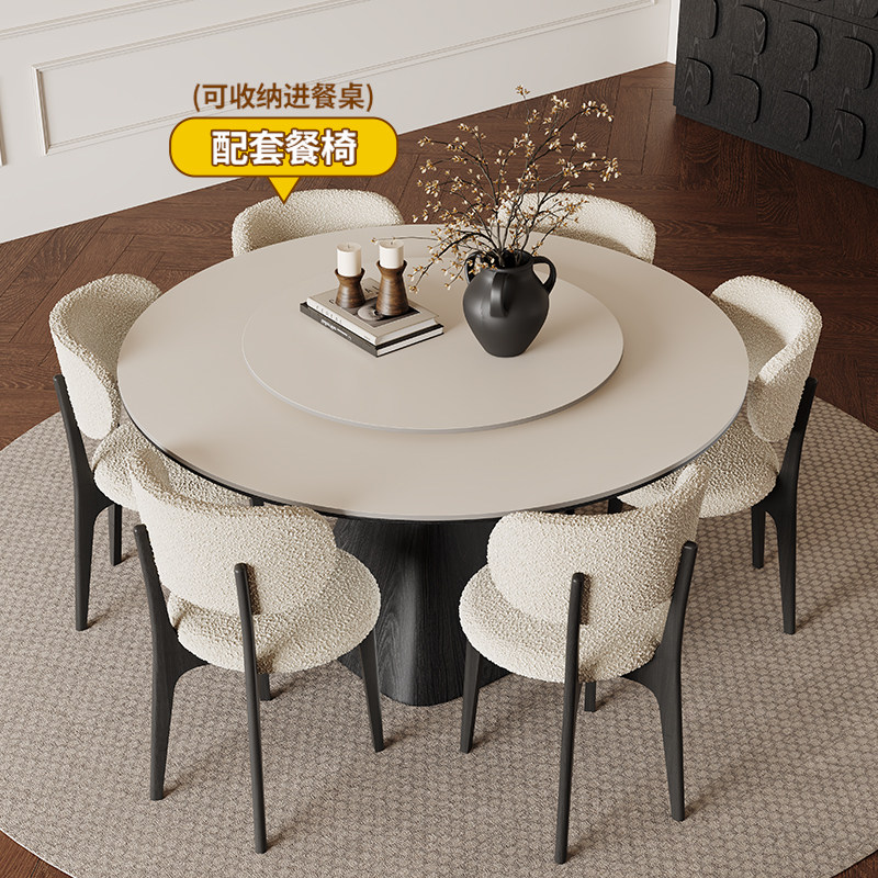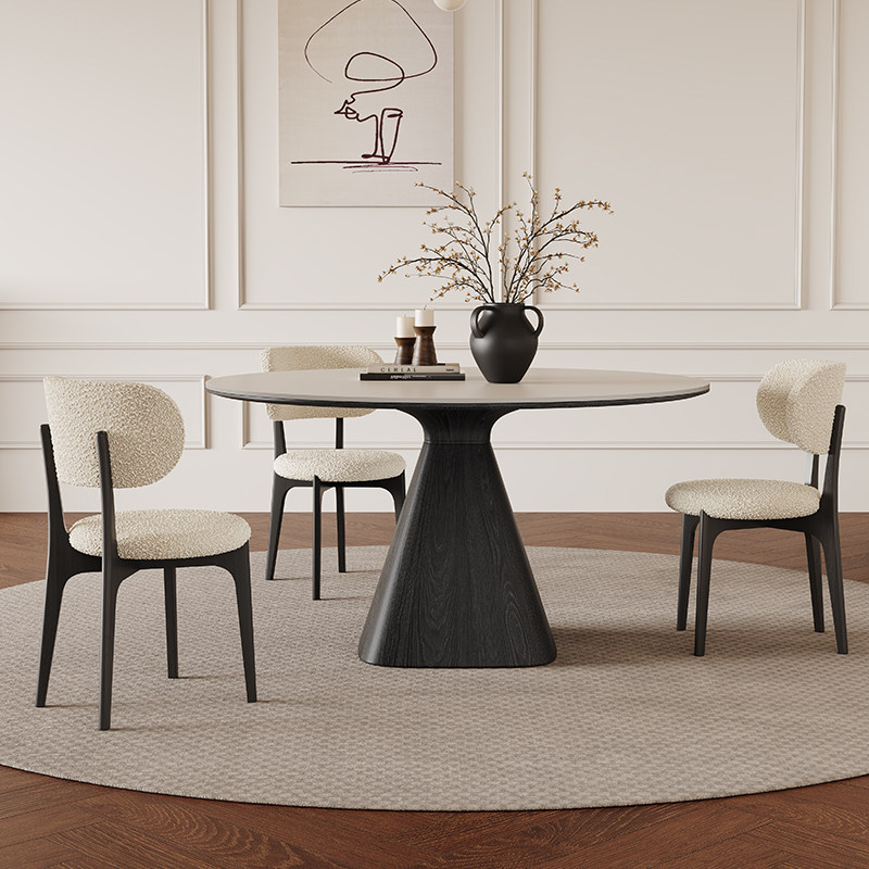 法式复古实木圆桌黑色白蜡木客厅饭桌家用现代简约纯白岩板餐桌椅