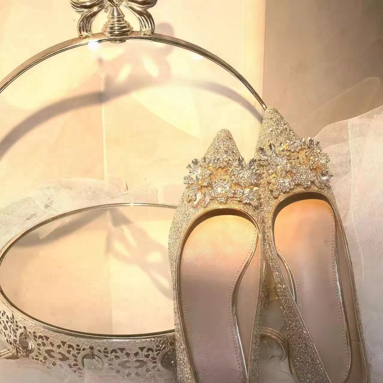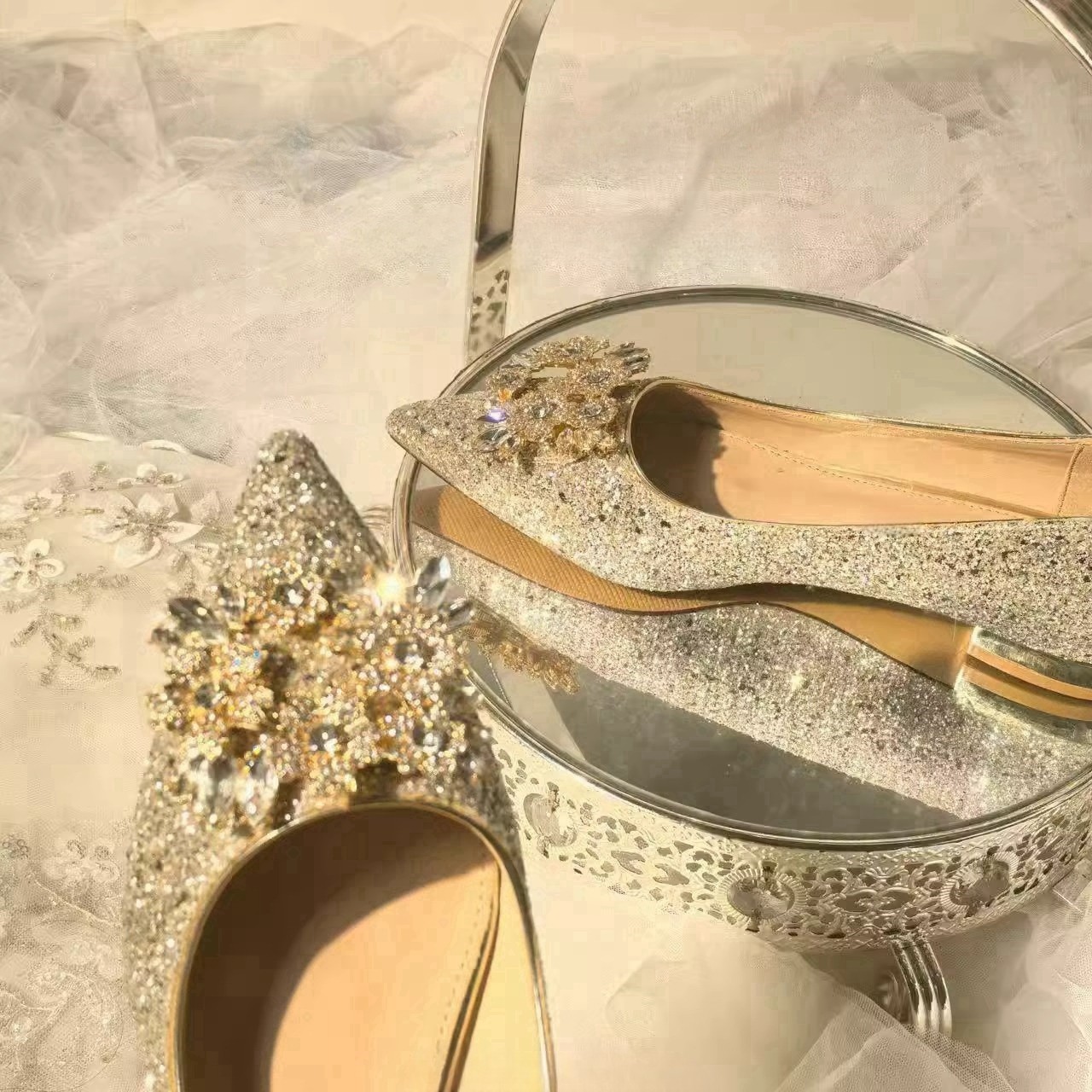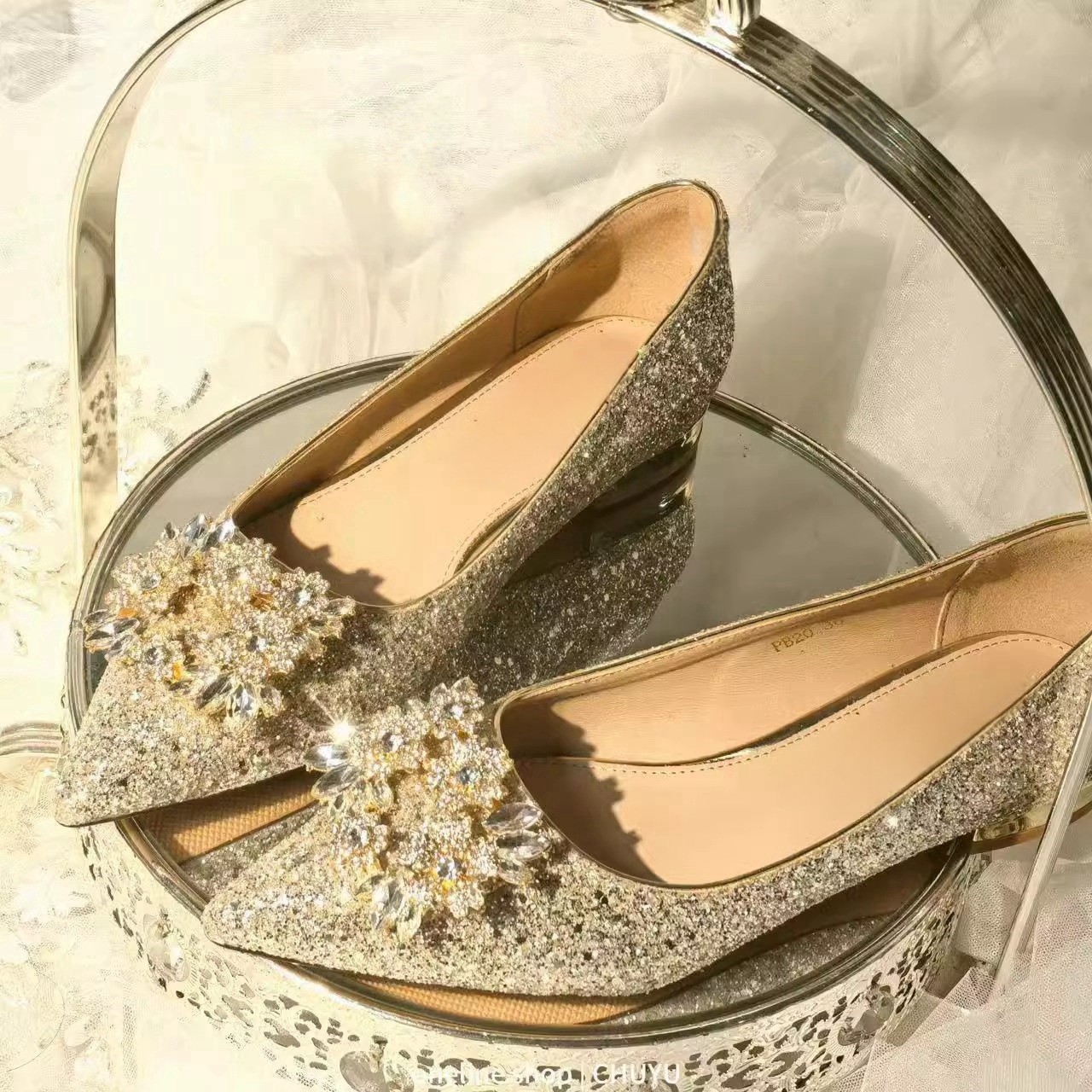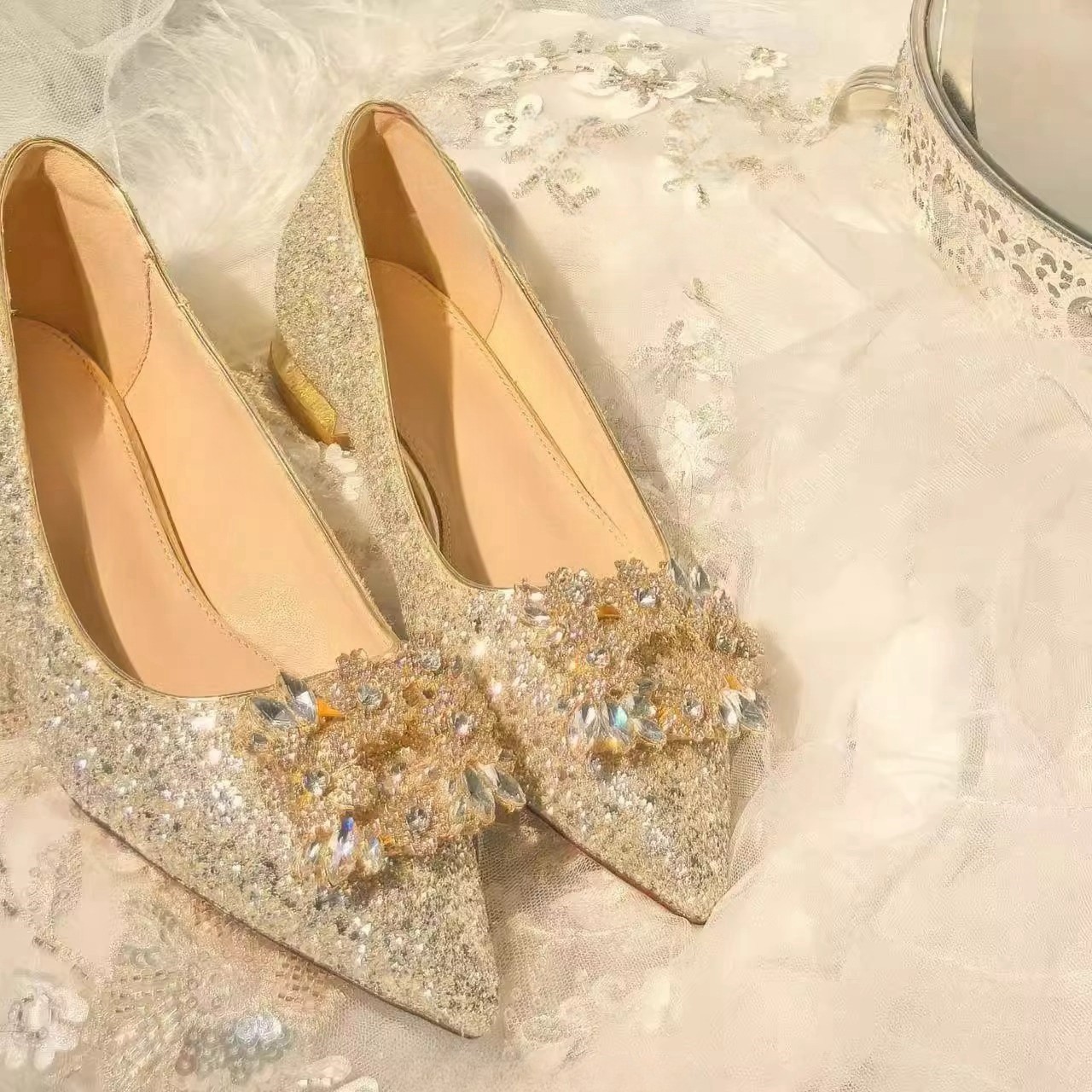 婚鞋女2024年新款主婚纱新娘鞋亮片香槟色水晶鞋尖头细跟高跟鞋女