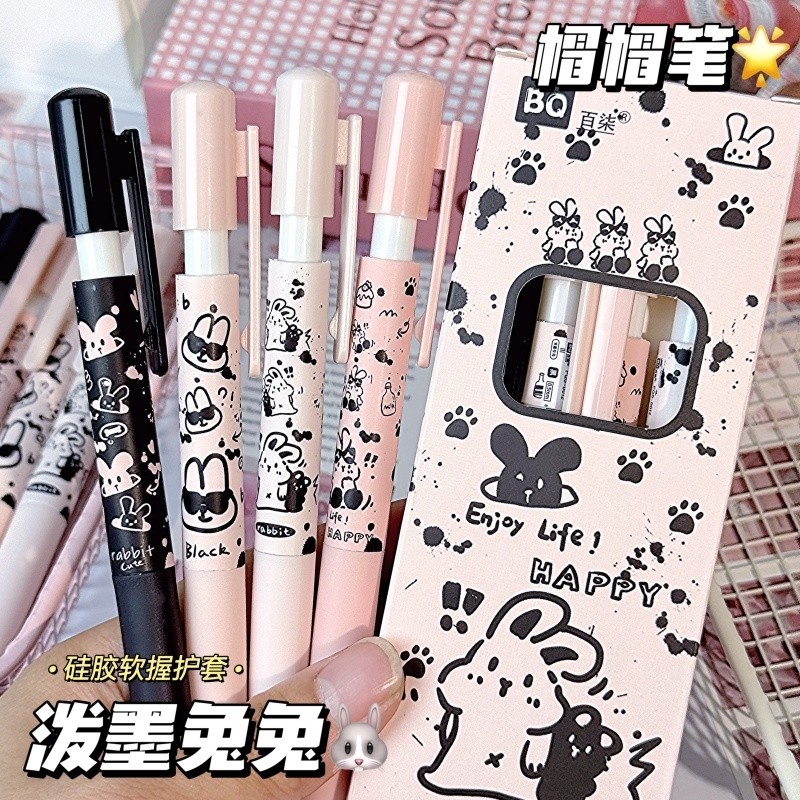 ins高颜值泼墨兔兔帽帽按动中性笔学生考试专用ST速干0.5刷题黑笔