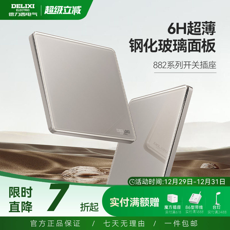 德力西旗舰店开关插座五孔家用墙开16A超薄钢化玻璃面板882砂陶棕