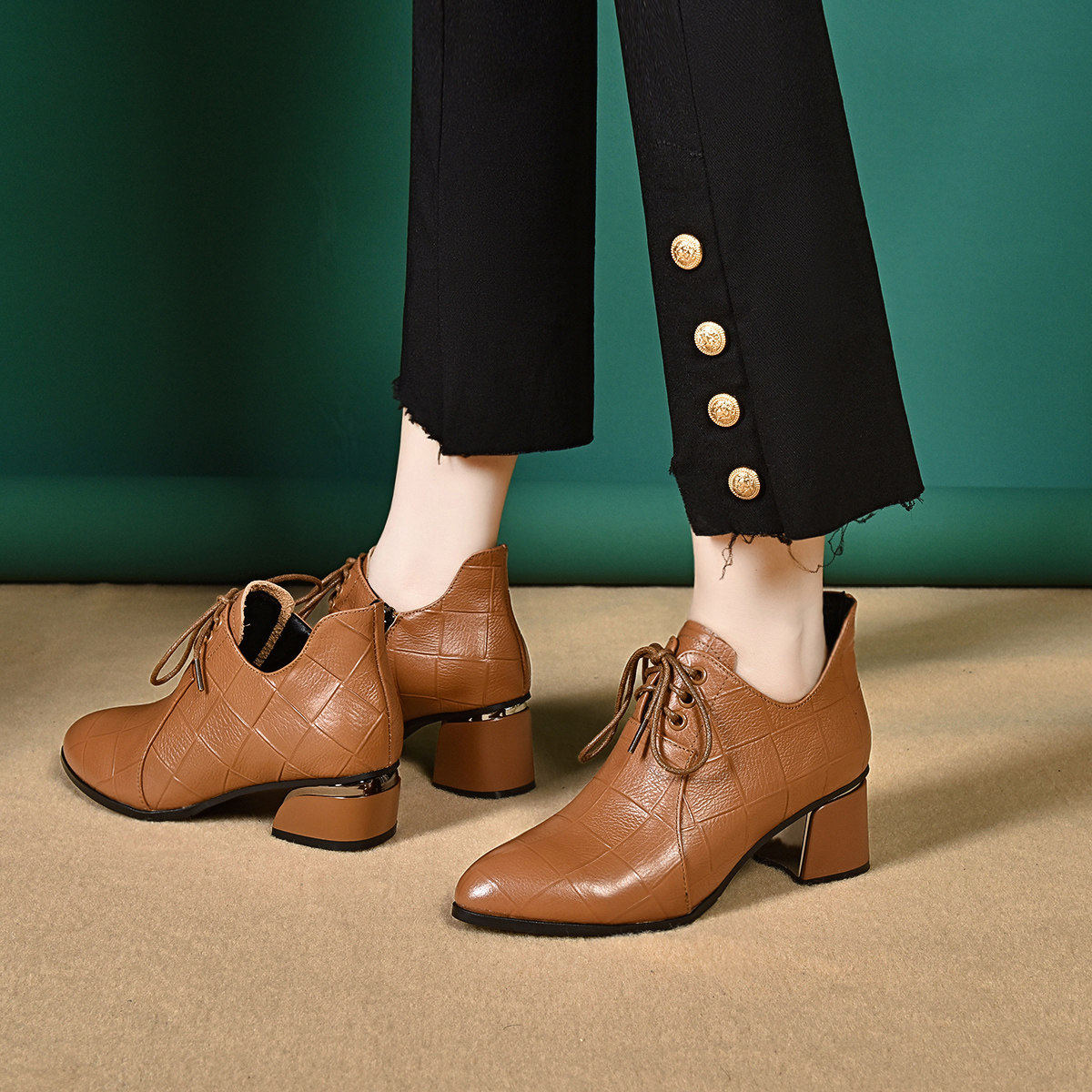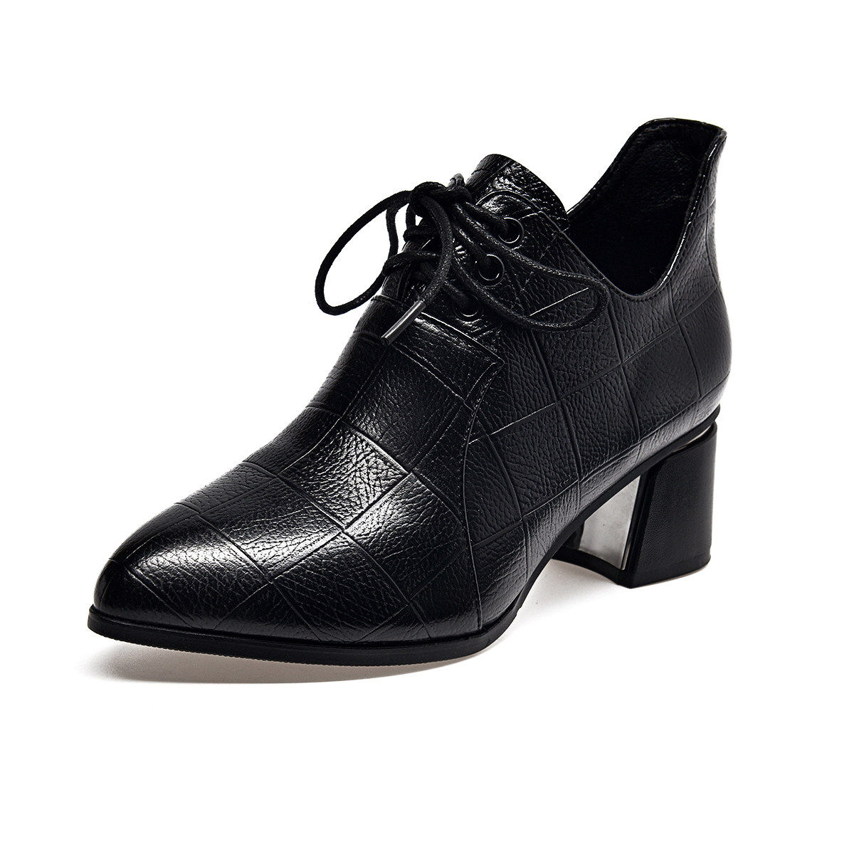 意尔康心选尖头小皮鞋2026春秋英伦风粗跟女鞋系带中跟百搭单鞋