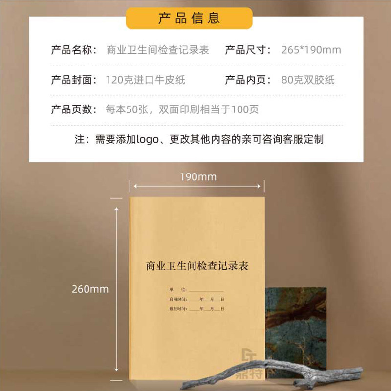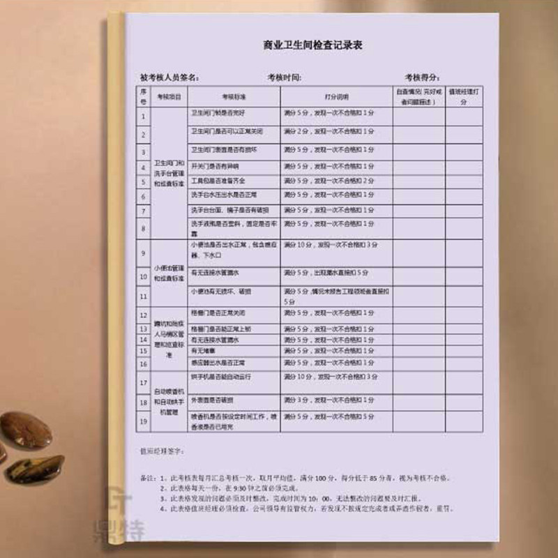商业卫生间检查记录表厕所环境检查卫生监测日常管理巡查登记本物业环卫工人卫生保洁员工工作监督日志台账本