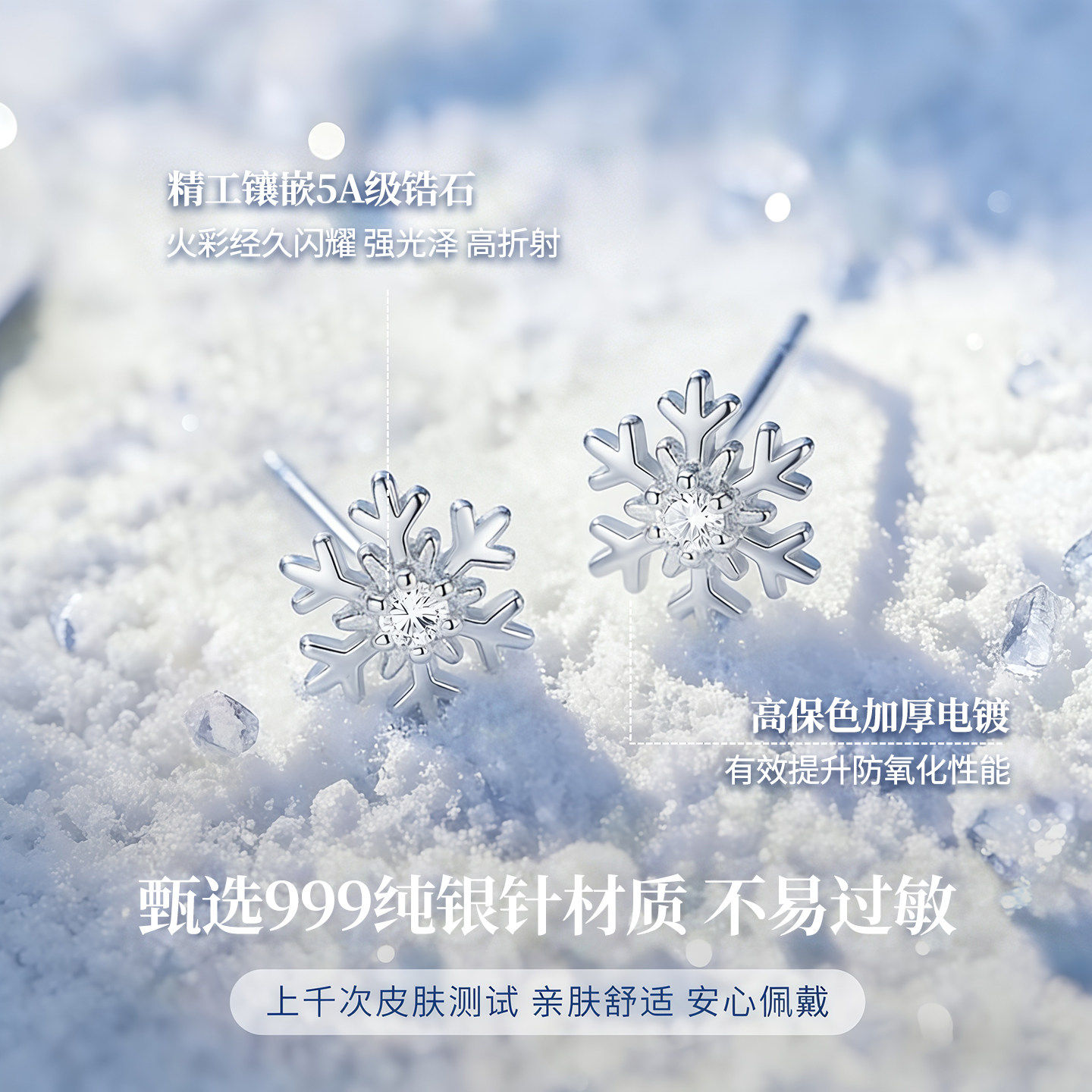 S999纯银针雪花耳钉女轻奢高级感养耳洞耳环2026新款爆款秋冬耳饰