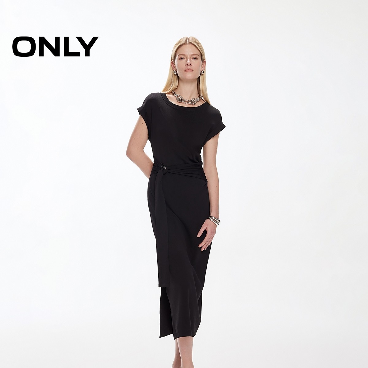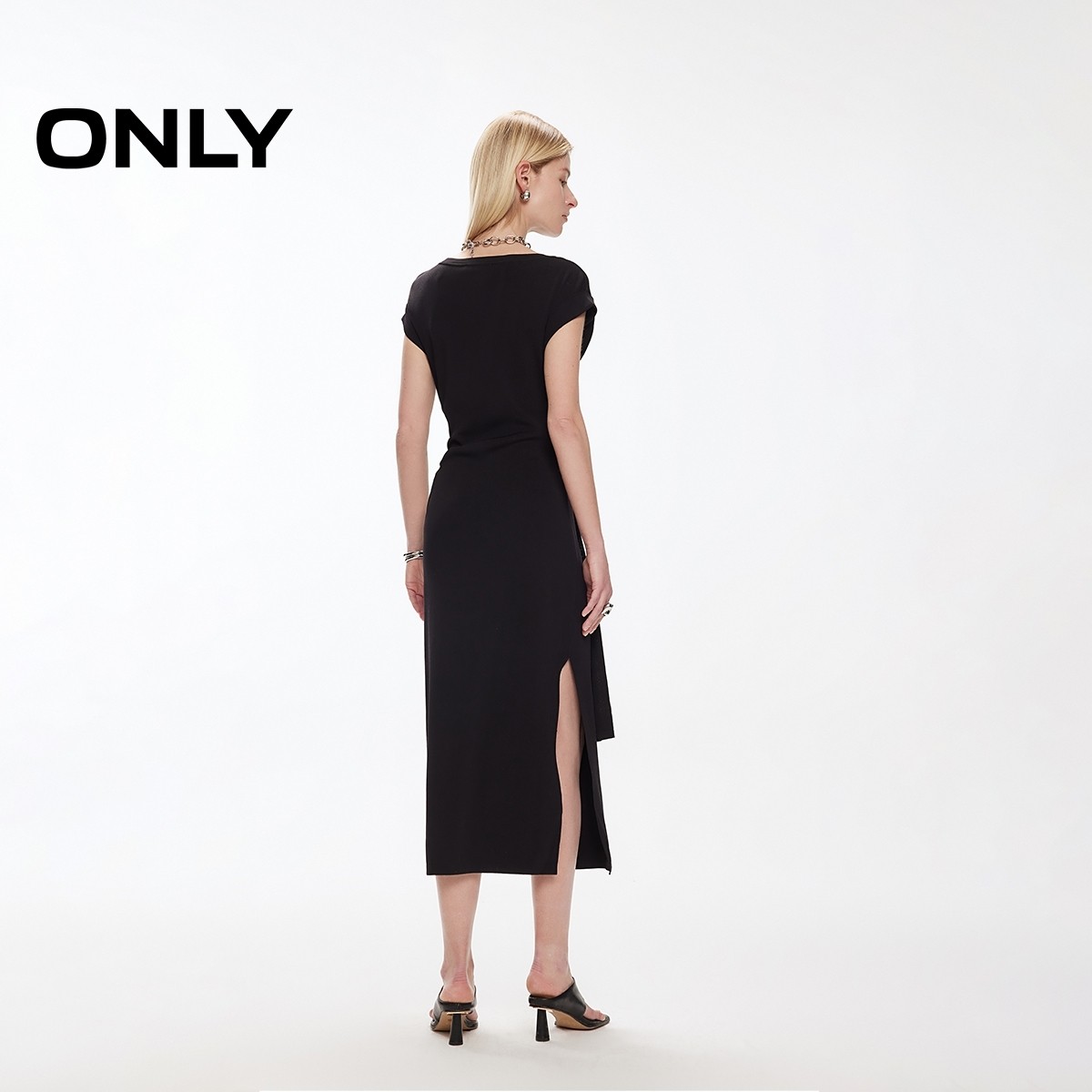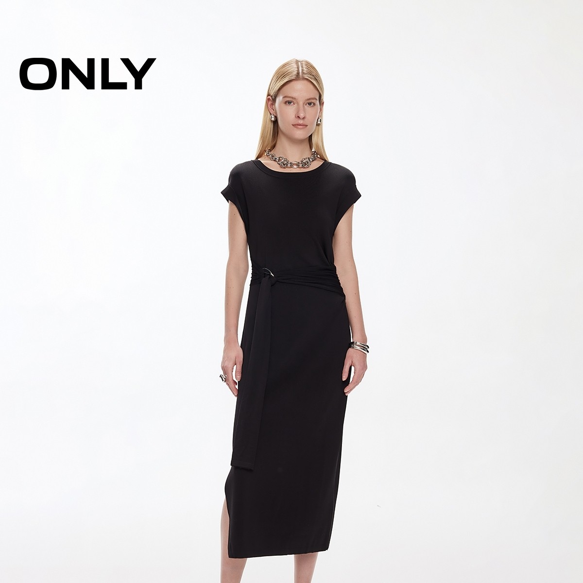 ONLY夏季性感开衩设计圆领短袖修身长款裙子针织黑色连衣裙女