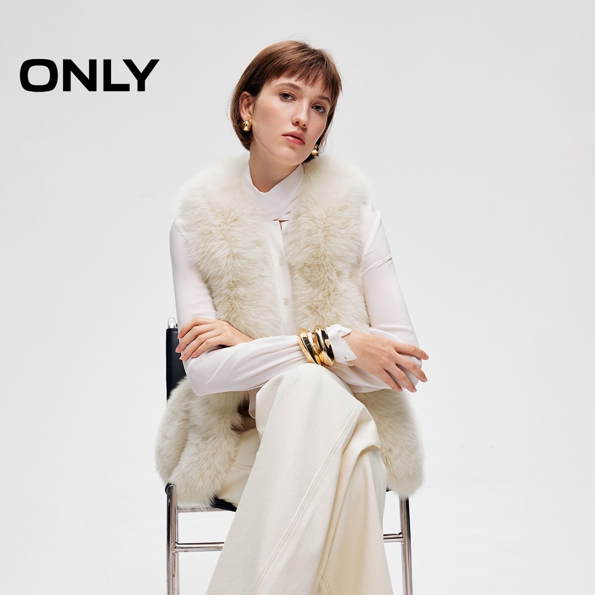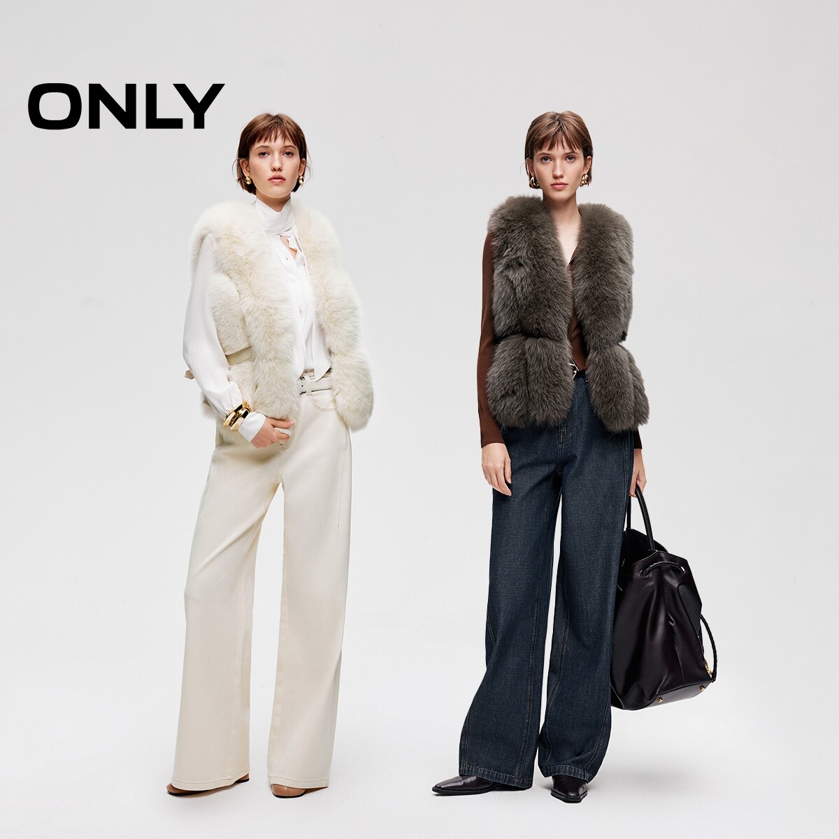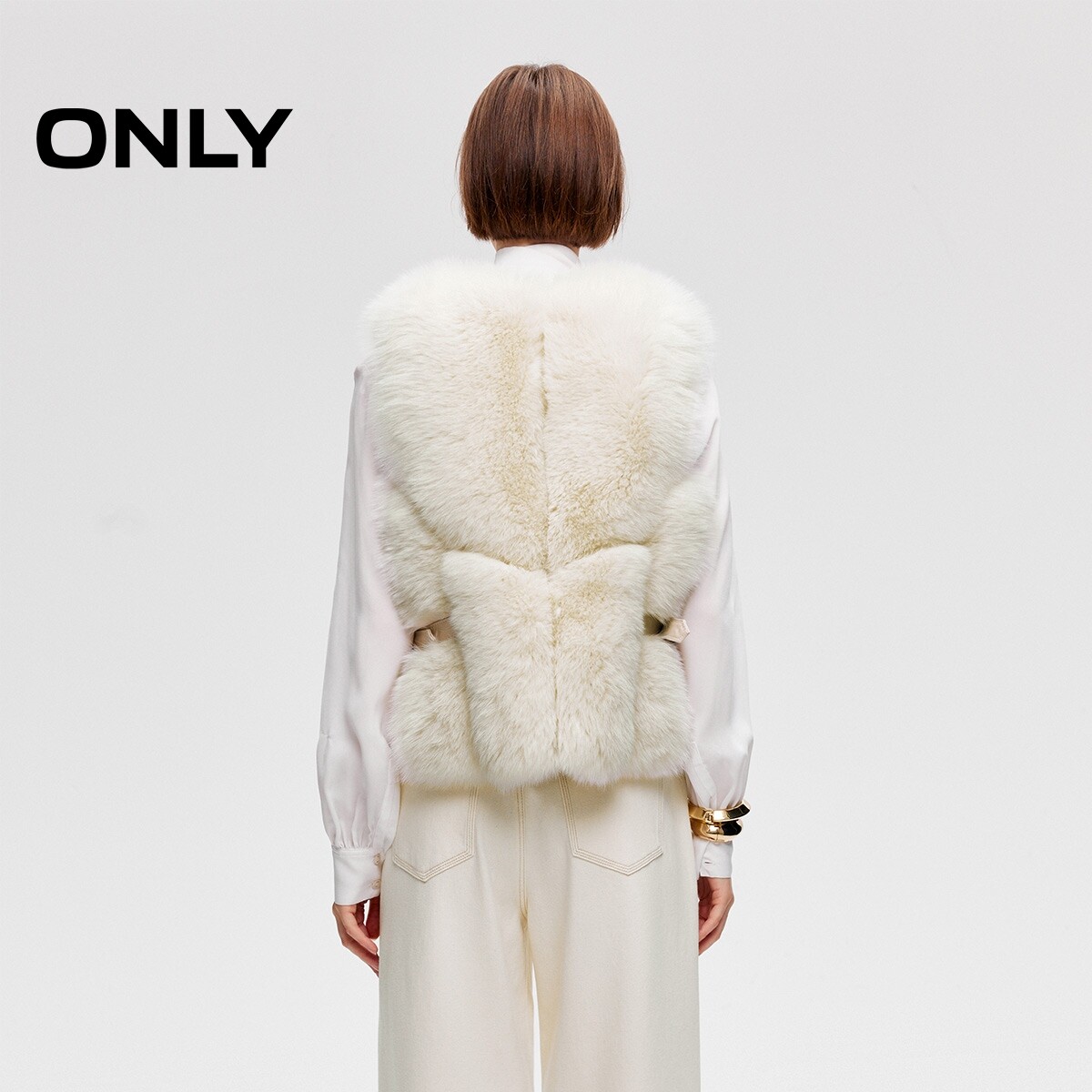 ONLY贵气保暖羊皮革狐狸皮毛拼接纯色马甲外套女