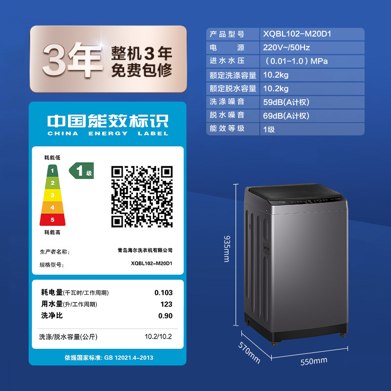 [换新补贴]海尔出品统帅10.2kg全自动波轮洗衣机租房家用大容量