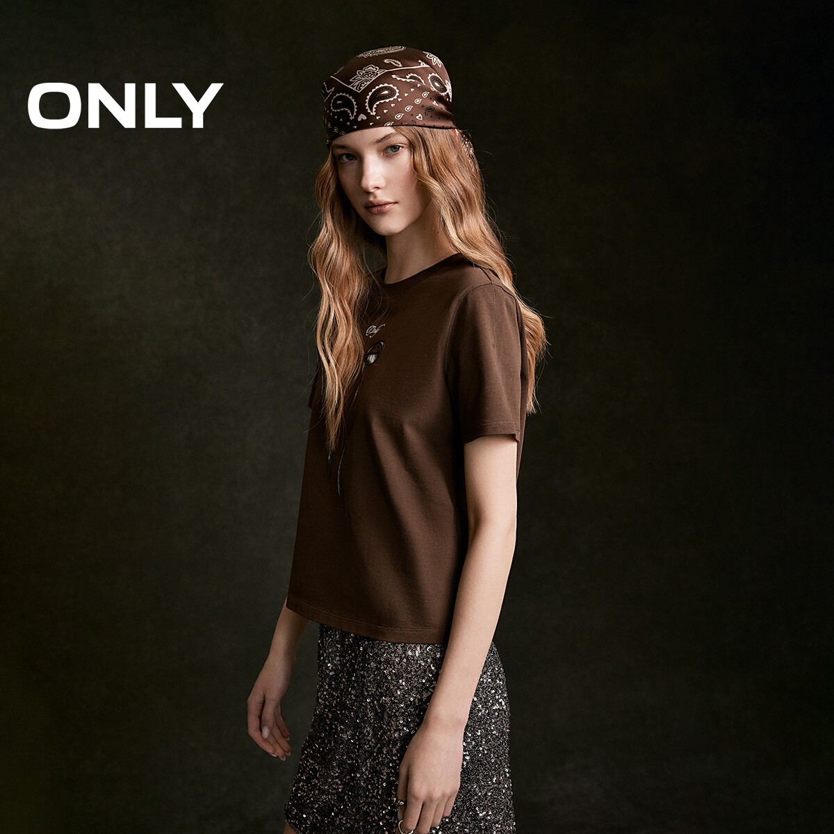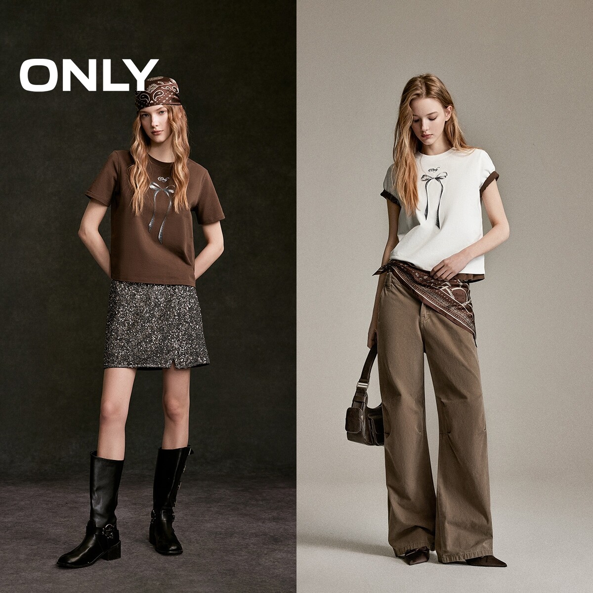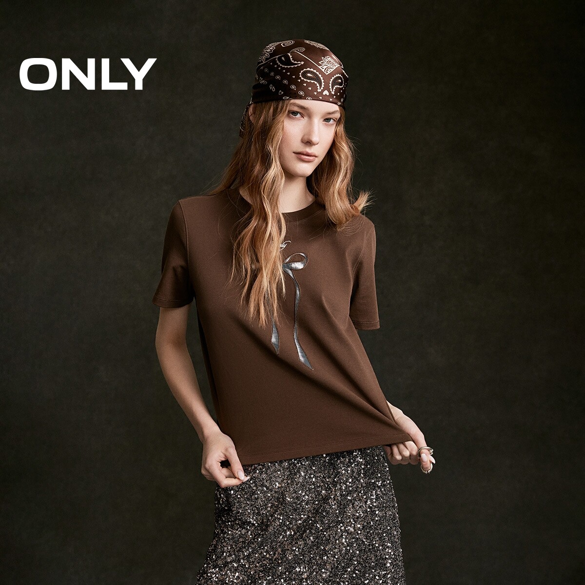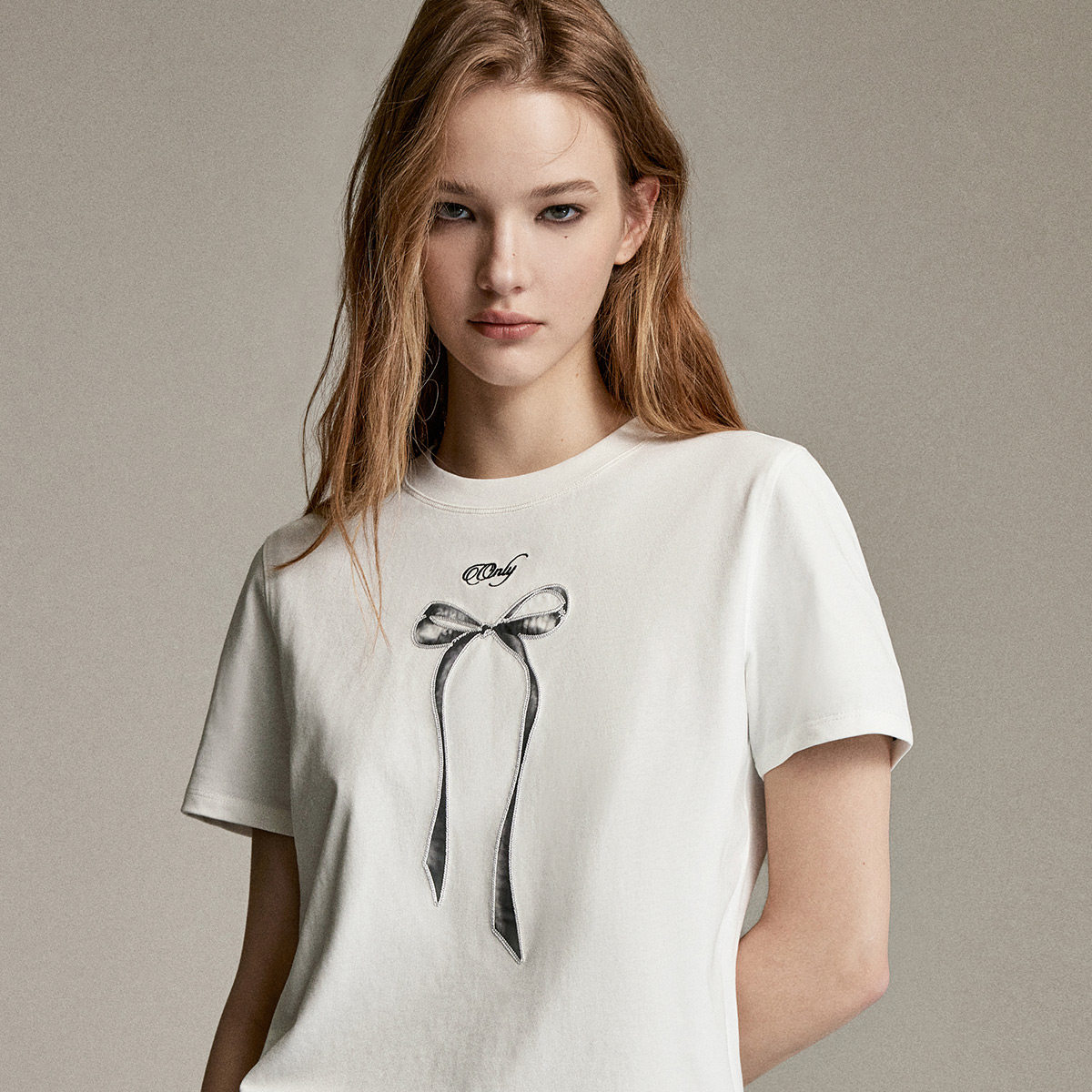 ONLY2026春季新款纯棉甜美立体重工刺绣蝴蝶结印花正肩短款T恤女