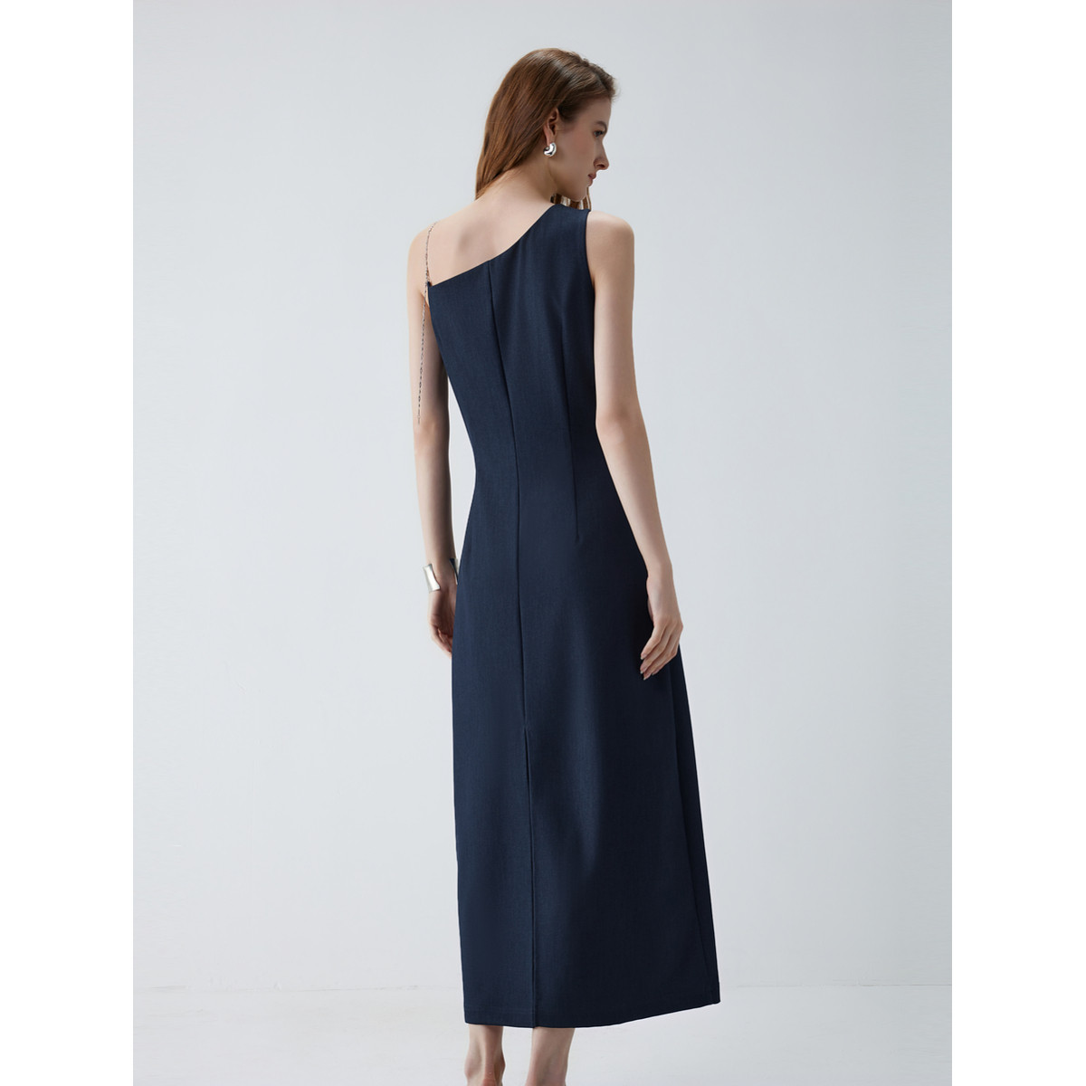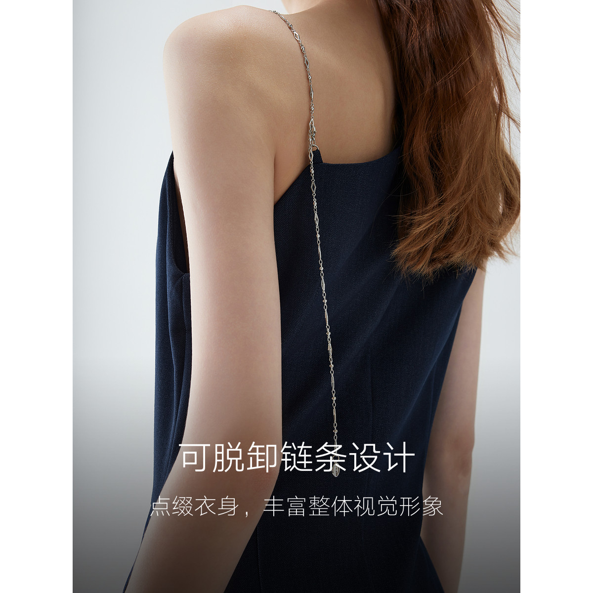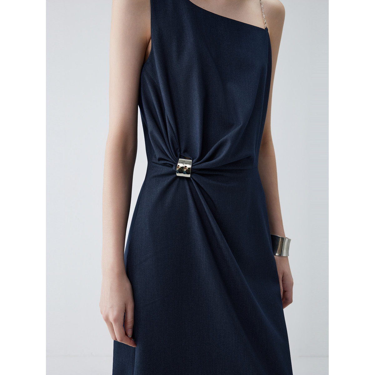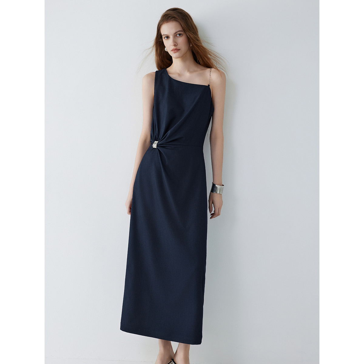 ELLE法式高级感斜肩连衣裙女2025秋季新款链条设计感收腰a字长裙
