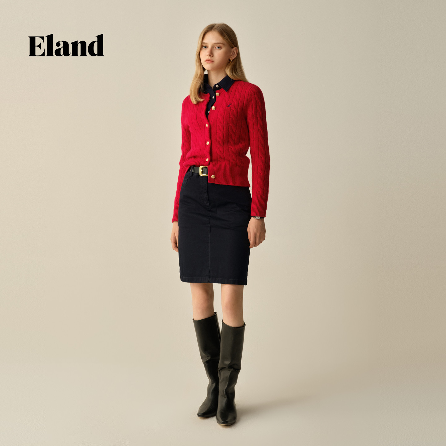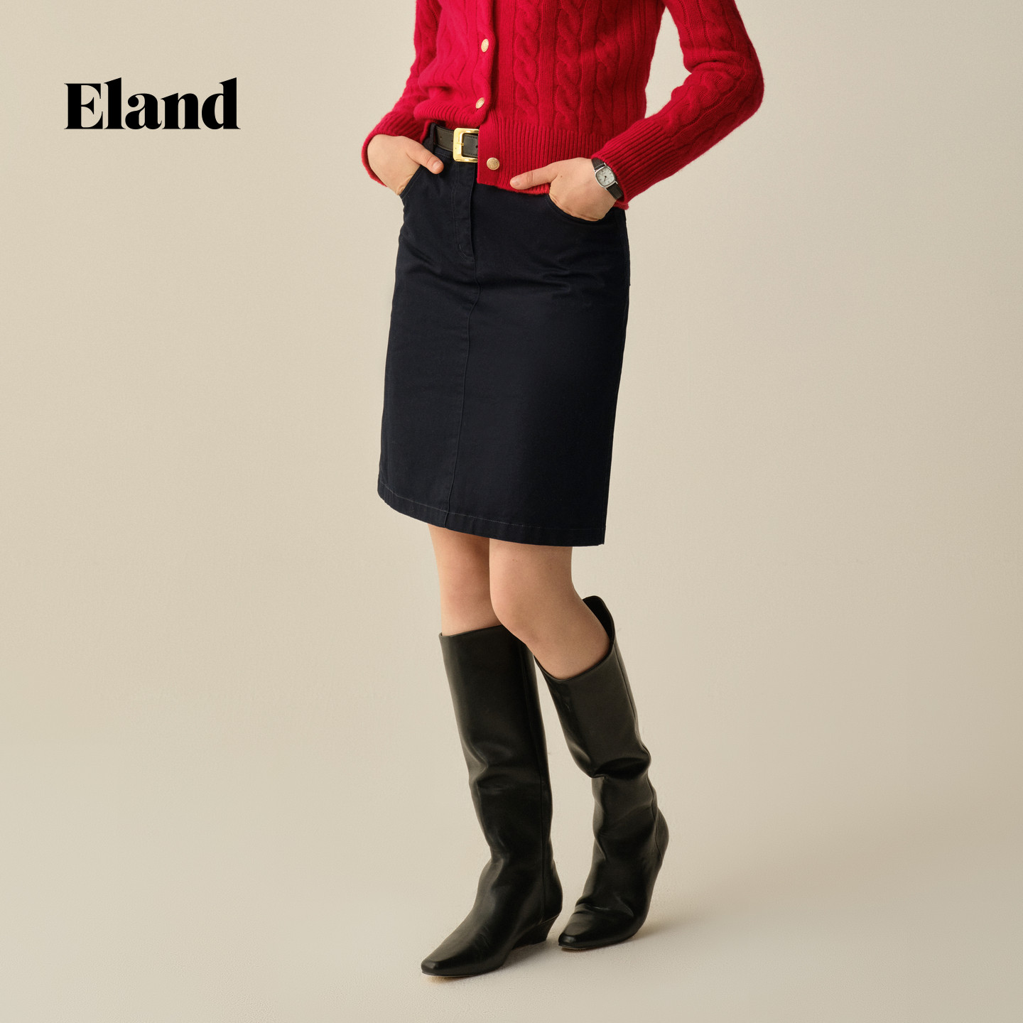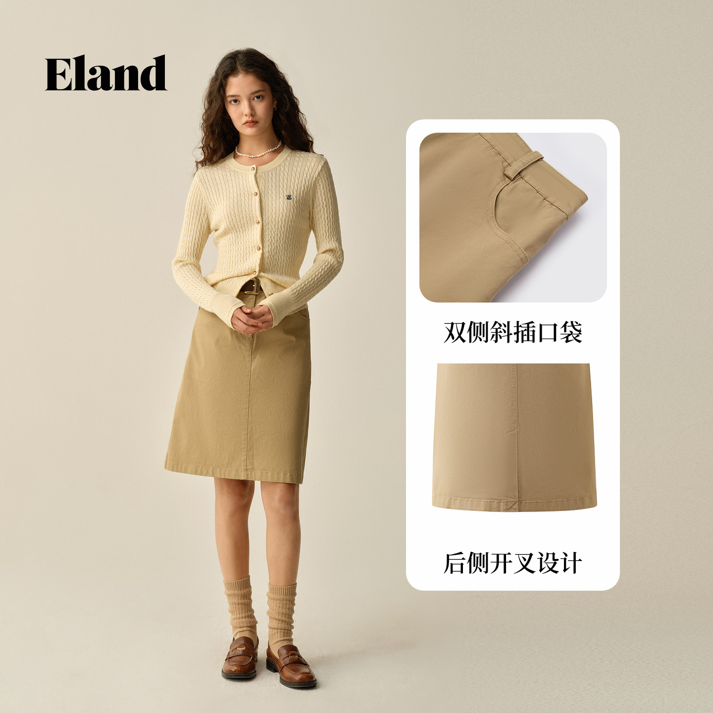 Eland衣恋半身裙女纯色棉质休闲通勤A字裙2025冬季新款