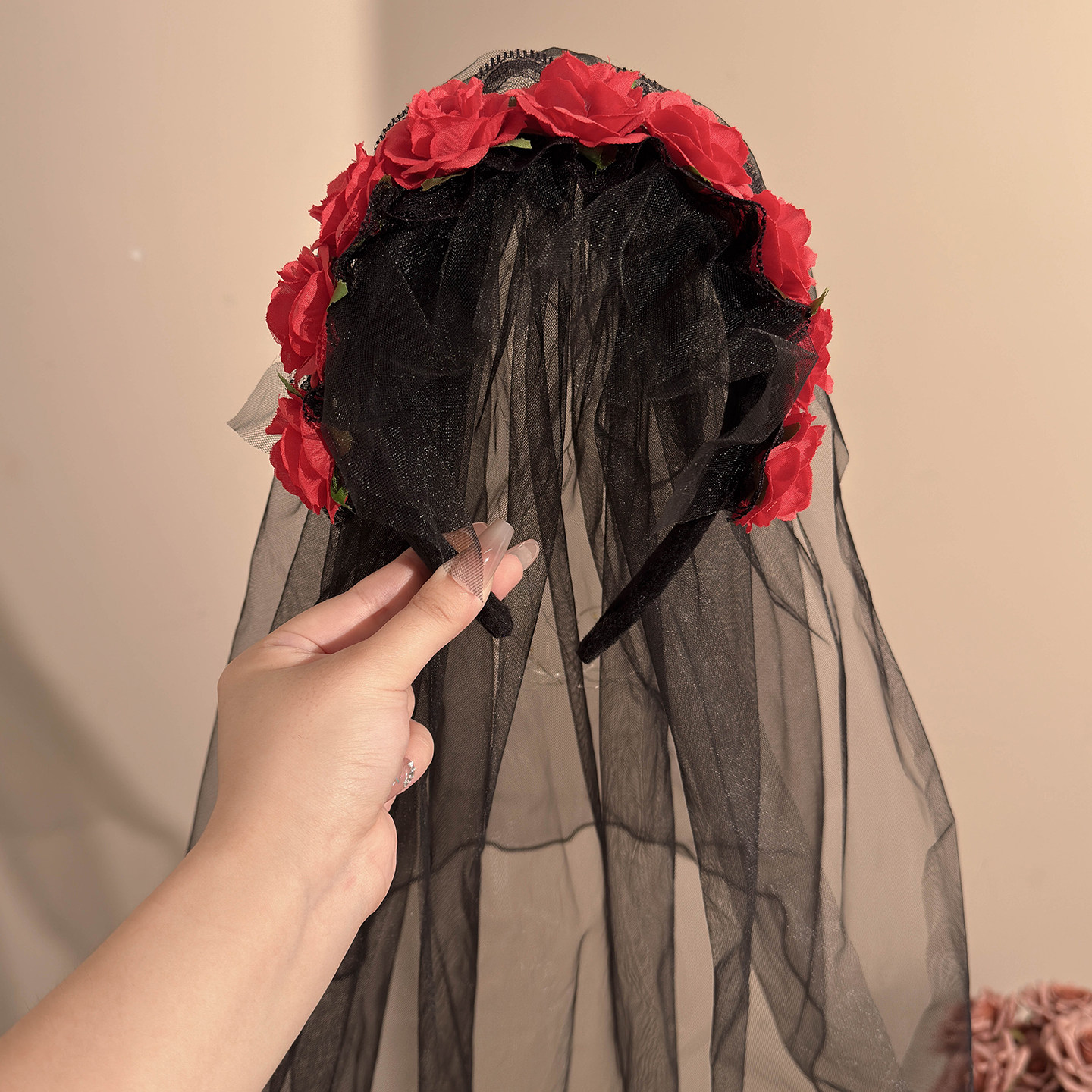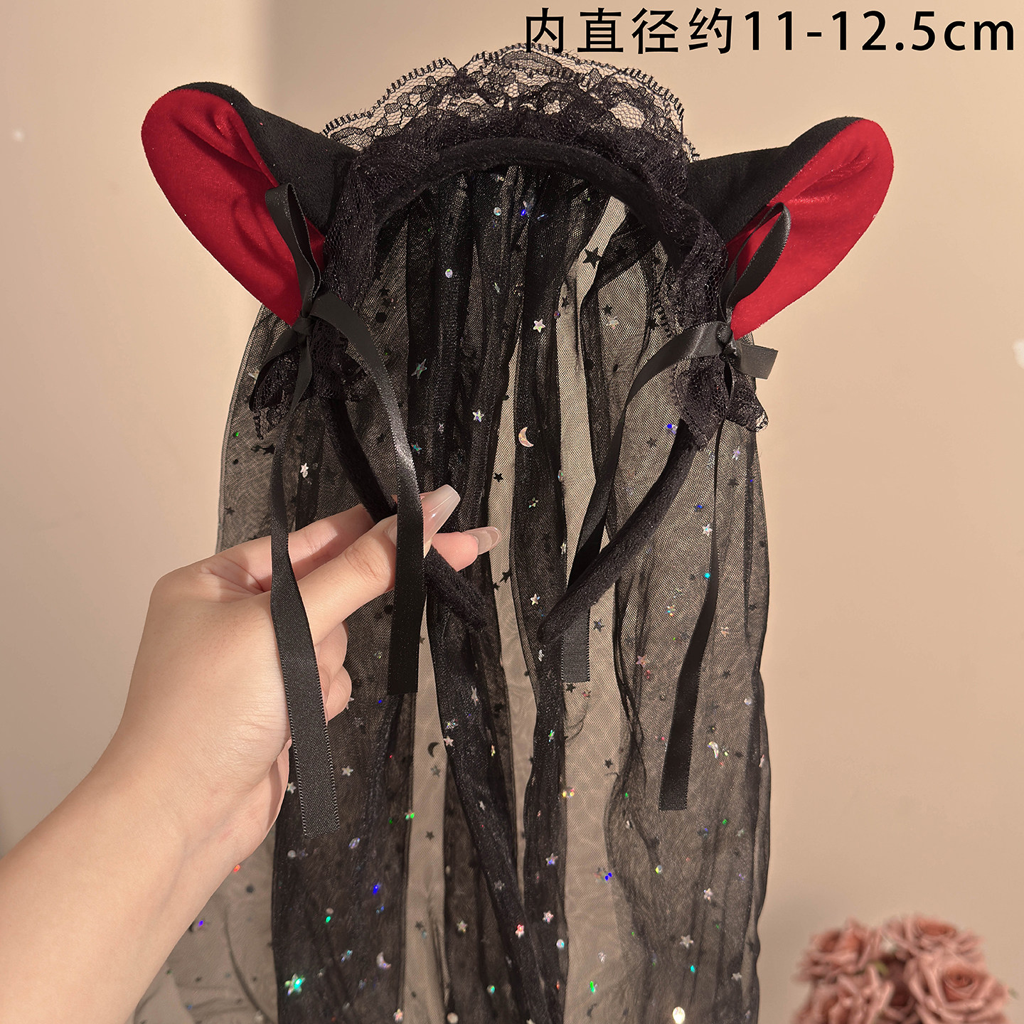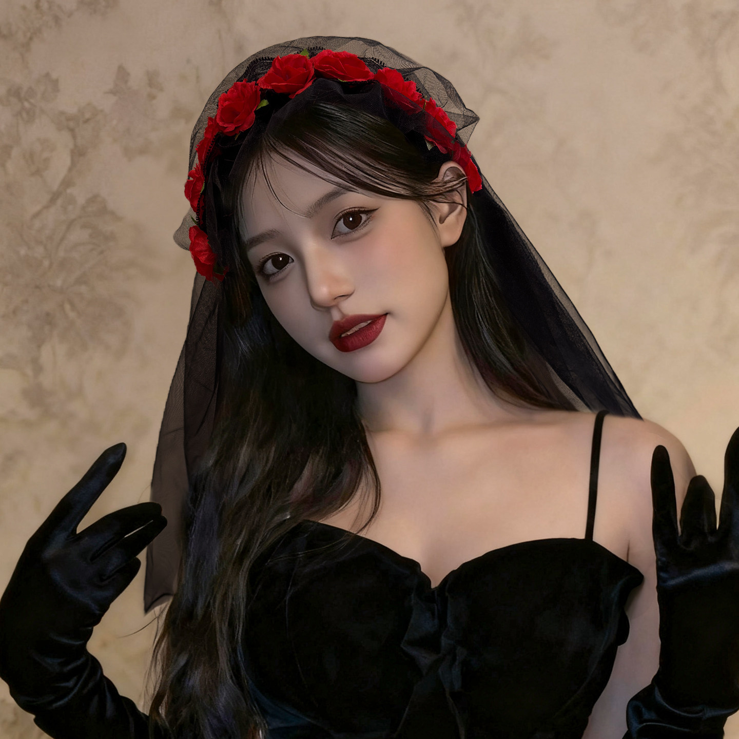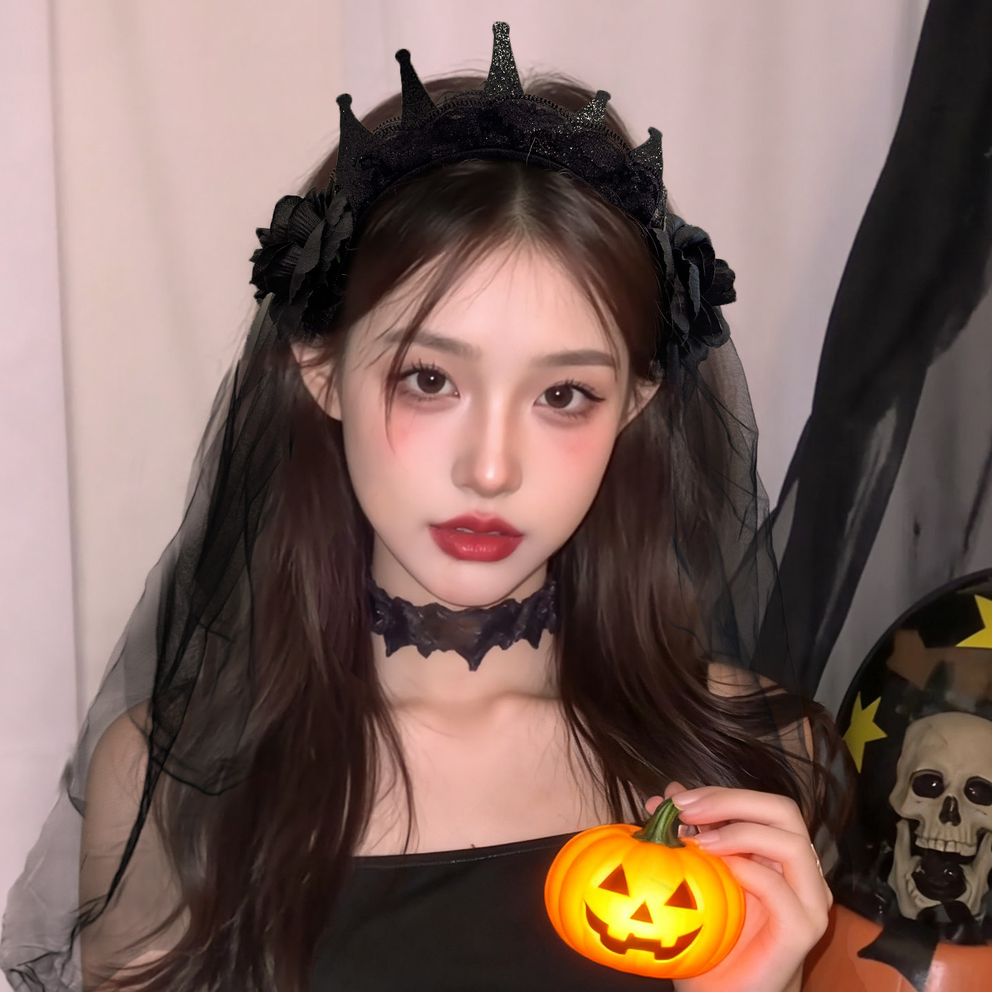 黑色玫瑰蕾丝皇冠网纱发箍暗黑女王cos道具万圣节装扮头箍发饰女