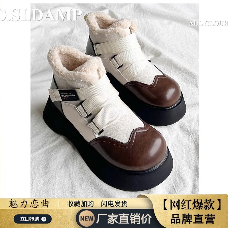 miu家厚底雪地靴女冬季真皮短靴羊毛侧拉链增高厚底加绒毛毛棉鞋