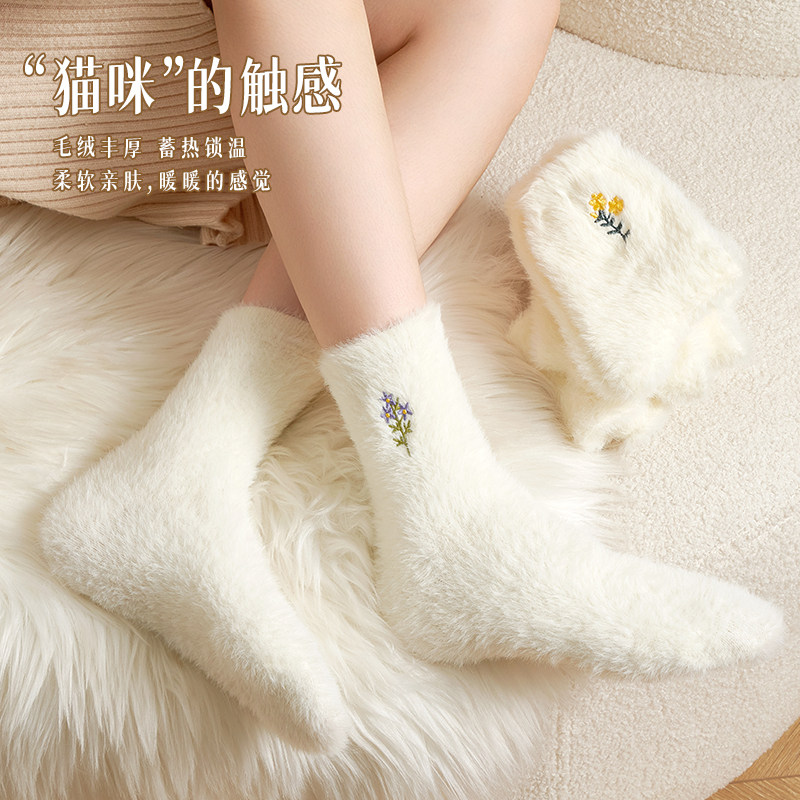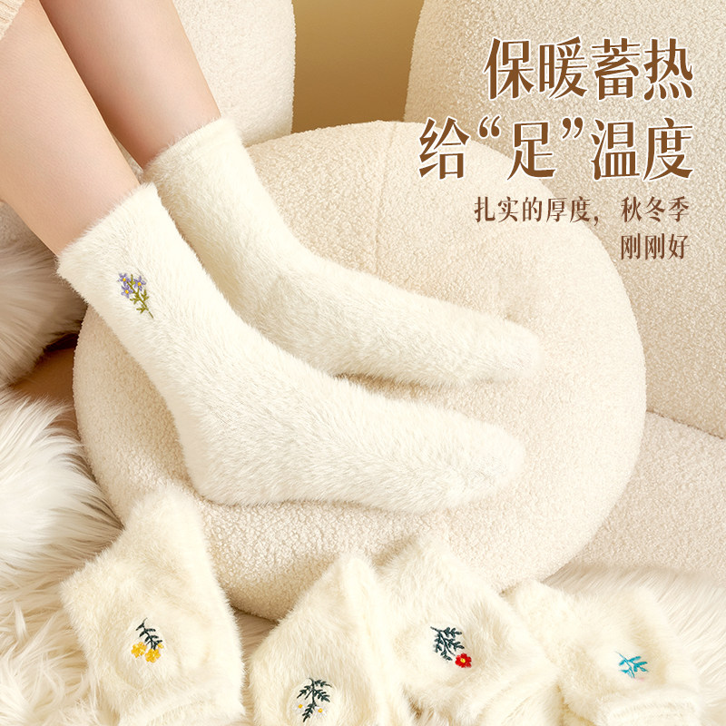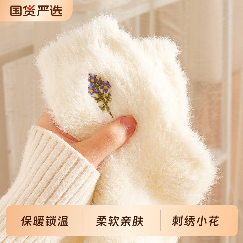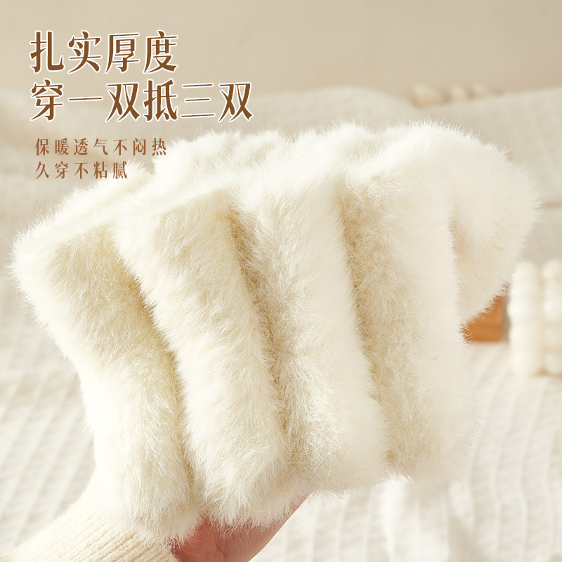 厚袜子女中筒水貂绒秋冬款白色加绒加厚珊瑚绒月子保暖睡眠袜家居