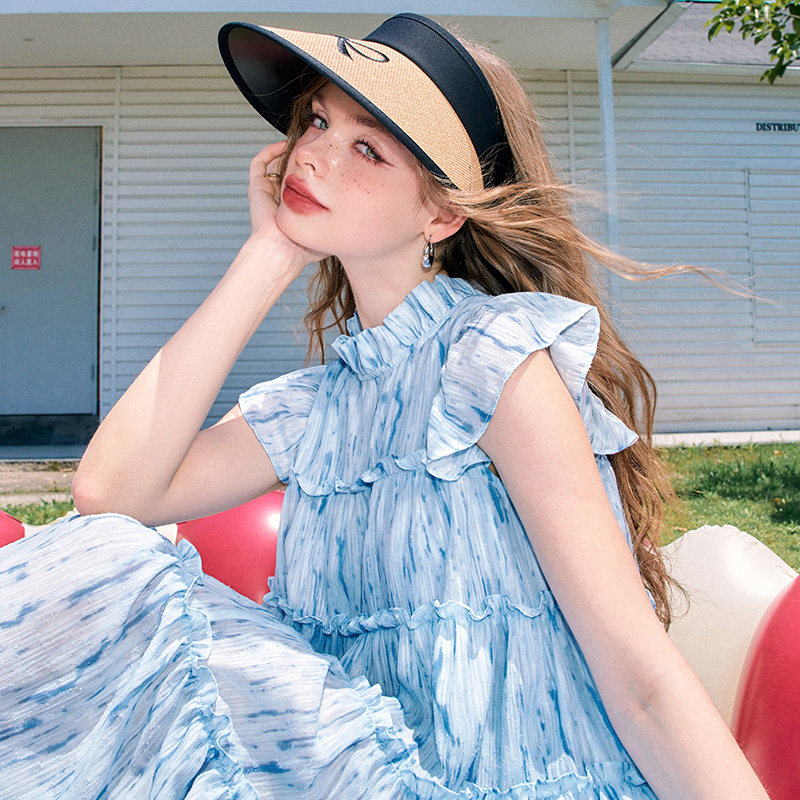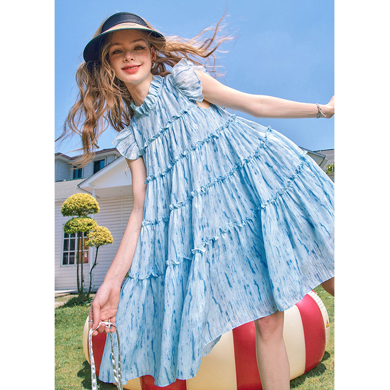 妖精的口袋小飞袖娃娃领蓝色连衣裙女2025年夏季新款小个子公主裙