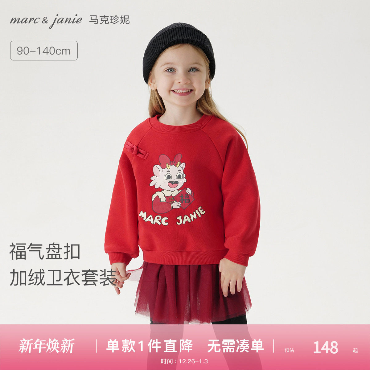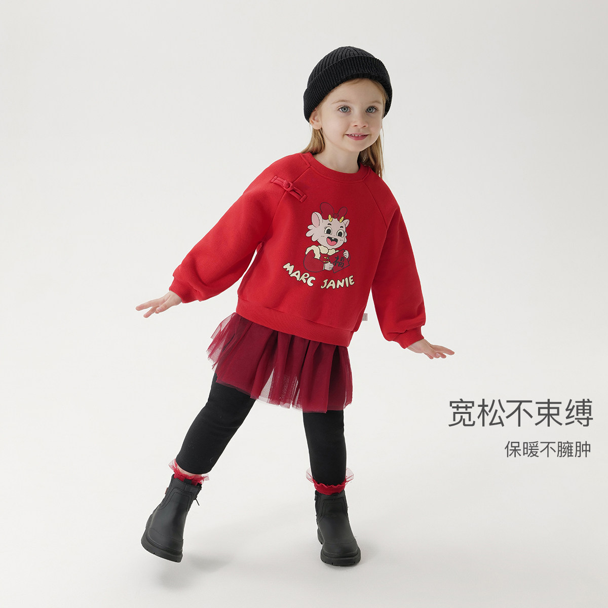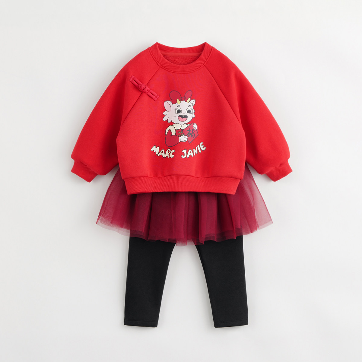 [加绒]马克珍妮女童国潮小龙人卫衣套装宝宝新年红套装冬款232086