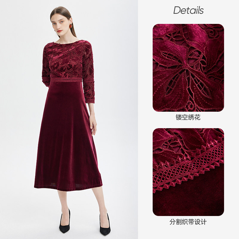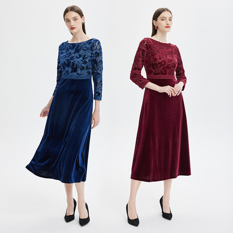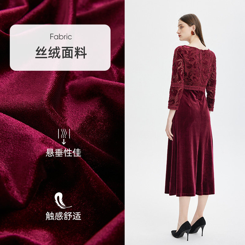 马天奴秋冬新款纯色绣花丝绒连衣裙高腰长裙礼裙中式婚宴气质礼裙